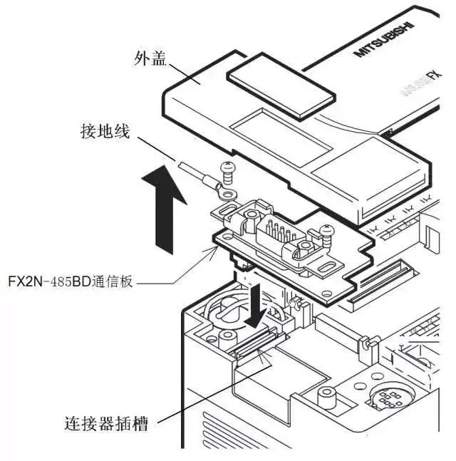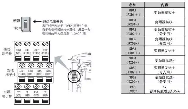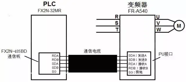 ②以模拟量方式控制; ③以通信方式控制。 变频器有很多开关量端子,如正转、反转和多档转速控制端子等,不使用PLC时,只要给这些端子接上开关就能对变频器进行正转、反转和多档转速控制。当使用PLC控制变频器时,若PLC是以开关量方式对变频进行控制,需要将PLC的开关量输出端子与变频器的开关量输入端子连接起来,为了检测变频器某些状态,同时可以将变频器的开关量输出端子与PLC的开关量输入端子连接起来。 PLC以开关量方式控制变频器的硬件连接如下图所示。当PLC内部程序运行使Y001端子内部硬触点闭合时,相当于变频器的STF端子外部开关闭合,STF端子输入为ON,变频器启动电动机正转,调节10、2、5端子所接电位器可以改变端子2的输入电压,从而改变变频器输出电源的频率,进而改变电动机的转速。如果变频器内部出现异常时,A、C端子之间的内部触点闭合,相当于PLC的X001端子外部开关闭合,X001端子输入为ON。  (二)PLC以模拟量方式控制变频器的硬件连接 变频器有一些电压和电流模拟量输入端子,改变这些端子的电压或电流输入值可以改变电动机的转速,如果将这些端子与PLC的模拟量输出端子连接,就可以利用PLC控制变频器来调节电动机的转速。模拟量是一种连续变化的量,利用模拟量控制功能可以使电动机的转速连续变化(无级变速)。 PLC以模拟量方式控制变频器的硬件连接如下图所示,由于三菱FX2N-32MR型PLC无模拟量输出功能,需要给它连接模拟量输出模块(如FX2N-4DA),再将模拟量输出模块的输出端子与变频器的模拟量输入端子连接。当变频器的STF端子外部开关闭合时,该端子输入为ON,变频器启动电动机正转,PLC内部程序运行时产生的数字量数据通过连接电缆送到模拟量输出模块(DA模块),由其转换成0~5V或0~10V范围内的电压(模拟量)送到变频器2、5端子,控制变频器输出电源的频率,进而控制电动机的转速,如果DA模块输出到变频器2、5端子的电压发生变化,变频器输出电源频率也会变化,电动机转速就会变化。  PLC在以模拟量方式控制变频器的模拟量输入端子时,也可同时用开关量方式控制变频器的开关量输入端子。 (三)PLC以通信方式控制变频器的硬件连接(以RS485为例) PLC以开关量方式控制变频器时,需要占用较多的输出端子去连接变频器相应功能的输入端子,才能对变频器进行正转、反转和停止等控制;PLC以模拟量方式控制变频器时,需要使用DA模块才能对变频器进行频率调速控制。如果PLC以RS485通信方式控制变频器,只需一根RS485通信电缆(内含5根芯线),直接将各种控制和调频命令送给变频器,变频器根据PLC通过RS485通信电缆送来的指令就能执行相应的功能控制。 RS485通信是目前工业控制广泛采用的一种通信方式,具有较强的抗干扰能力,其通信距离可达几十米至上千米。采用RS485通信不但可以将两台设备连接起来进行通信,还可以将多台设备(最多可并联32台设备)连接起来构成分布式系统,进行相互通信。 当然还有其它的通讯方式,比如PROFIBUS和Ethernet等。 1.变频器的RS485通信口 三菱FR500系列变频器有一个用于连接操作面板的PU口,该接口可用作RS485通信口,在使用RS485方式与其他设备通信时,需要将操作面板插头(RJ45插头)从PU口拔出,再将RS485通信电缆的一端插入PU口,通信电缆另一端连接PLC或其他设备。三菱FR500系列变频器PU口外形及各引脚功能说明如下图所示。  三菱FR500系列变频器只有一个RS485通信口(PU口),面板操作和RS485通信不能同时进行,而三菱FR700系列变频器除了有一个PU接口外,还单独配备了一个RS485通信口(接线排),专用于进行RS485通信。三菱FR700系列变频器RS485通信口外形及各脚功能说明如下图所示,通信口的每个功能端子都有2个,一个接上一台RS485通信设备,另一个端子接下一台RS485通信设备,若无下一台设备,应将终端电阻开关拨至“100Ω”侧。  2.PLC的RS485通信口 三菱FX PLC一般不带RS485通信口,如果要与变频器进行RS485通信,须给PLC安装FX2N-485BD通信板。485BD通信板的外形和端子如下图(a)所示,通信板的安装方法如下图(b)所示。  (a)外形