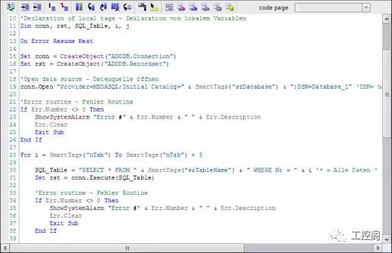 在本例中的表最多可以同时输出6条记录,在 WinCC flexible 中可以使用箭头按钮实现对表的选取。变量"Tab"的值会在零和条目数减去显示的数据记录数量之间变化。当选择的表发生变化,SQL 表的指针也发生移动。这是通过指令“MoveNext”来实现的。