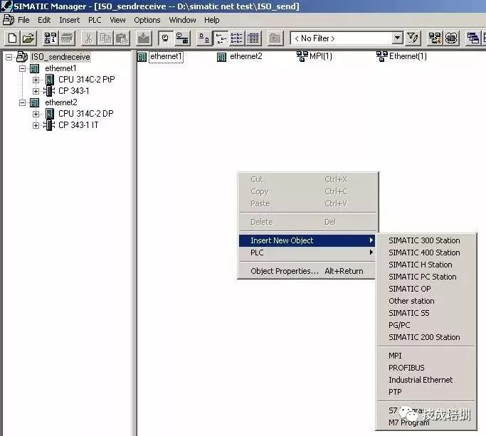 第一步:打开SIMATIC Manager,根据我们系统的硬件组成,进行系统的硬件组态,如图插入2个S7300的站,进行硬件组态: