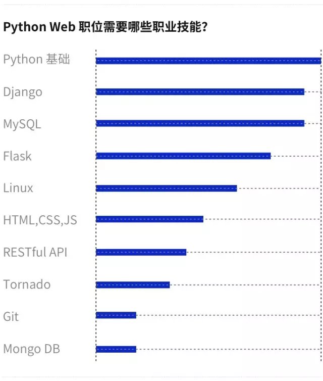 根据我们的统计,目前在招的Python web 职位,所需技能按优先级中,Python基础和Django的优先级是最高的。具体的排序,大致可以参考以下的这张图表: