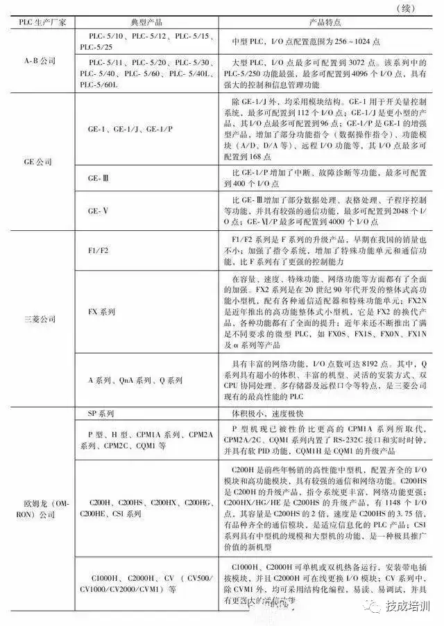 而日本的PLC技术是由美国引进的,对美国的PLC产品有一定的继承性,但日本的主推产品定位在小型PLC上。美国和欧洲以大中型PLC而闻名,而日本则以小型PLC著称。 常见的PLC如表所示: