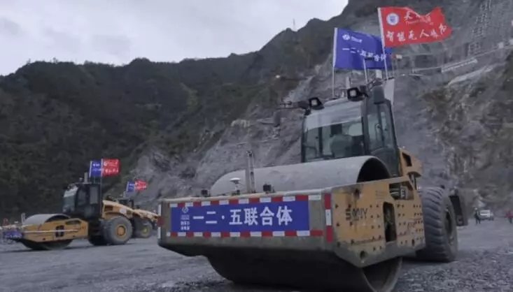 据了解,施工采用的新型无人智能碾压机,重达26吨。它们就像一个个会移动的钢铁大力士,依靠自身的重量把土料碾压平整。为使大坝固若金汤密不透水,无人智能碾压机需要把土料中的缝隙压缩到比水分子还小的程度。为了这座295米烦人心墙,无人智能碾压车需要反复碾压1万多遍。