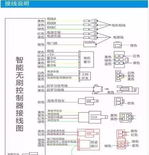 第六电车上各个线什么意思的确定方法:顺着电机找到电机3根相位线5根霍尔线,拆下转把找到3根转把线,拆掉刹把可以找到2根刹车线。拆开电瓶可以看到“+”电源正极“-”电源负极。总的来说按大件找,按大件安装,最容易理解最准确。 第七若电机还不正常转有可能霍尔坏了,测试霍尔好坏的方法:整车上带电检测,先把各线路及接插件都接好,把万用表拔到直流电压20V档位,先确认控制器有5V电源输出,再用黑表笔接在霍尔的地线,红表笔分别接三根信号线,在量的同时,用手轻轻转动电机,霍尔正常时,万用表会0V--5V的脉冲电压的数据显示,如果测某只霍尔时没有脉冲电压,则这只霍尔就坏了,[这种情况也可以用指针式万用表检测,指针在0V--5V之间摆动,霍尔是好的;如果指针不摆动,霍尔是坏的]用这种方法是最为可靠的方法,前提是带电操作。 第八 接仪表线:拆开仪表会发现仪表有2根线,一根接在防盗接口上一根在控制器的仪表线上。 第九 找转把线:拆下转把会发现转把就3根线,对着颜色就可以找到了,或者用万用表测量。 第十 接刹车断电线:拆下刹把会发现刹把有2根线[刹把就是一个常开开关],把这2根线直接接在控制器刹车断电上就可以了。 第十一 安装完成后用脚踏称把撑起整车后,连接好控制器将学习线对插再打开电门锁,这时会进入自学习,当转动正常后,如发现电机运行方向相反就调一下调速转把,就能改变电机运行方向,然后拨开学习线即可。 安装要点: 1、电源正负极一定不可以接反 2、先接电源线、电门锁线、转把线、电机线四组线; 3、线接好打开电门锁,转转把、若倒转,对接一下学习线,就正转了,然后拔掉学习线,接好其它线就可以了。