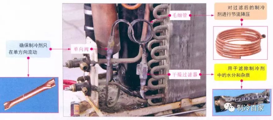 干燥过滤器、单向阀和毛细管是室外机中的干燥、闸阀、节流组件。
