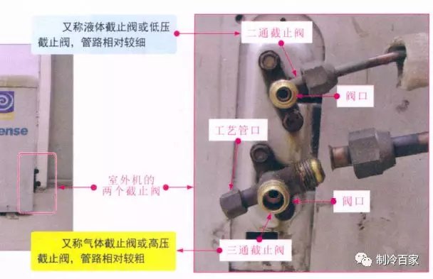 三通截止阀又叫做气体截止阀或高压截止阀,制 冷剂在通过该截止阀时呈现高压、气体状态,所以三通截止阀的管路较粗,并且三通截止阀 上还设有工艺管口,通过该管口是对空调器制冷管路进行检修或充注制冷剂的重要部件。
