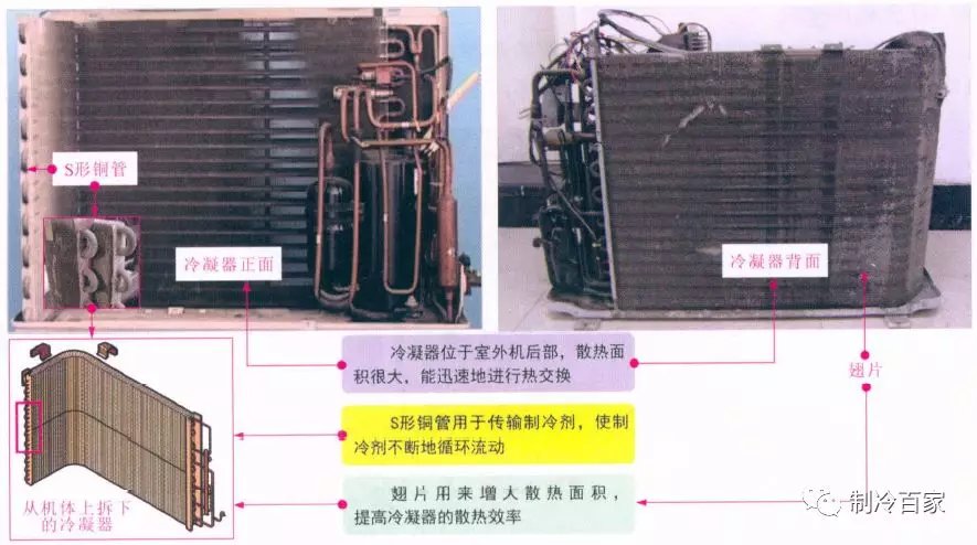 冷凝器是变频空调器室外机中重要的热交换部件,制冷剂流经冷凝器时,向外界空气散 热或从外界空气吸收热量,与室内机蒸发器的热交换形式始终相反,这样便实现了变频空调 器的制冷/制热功能。