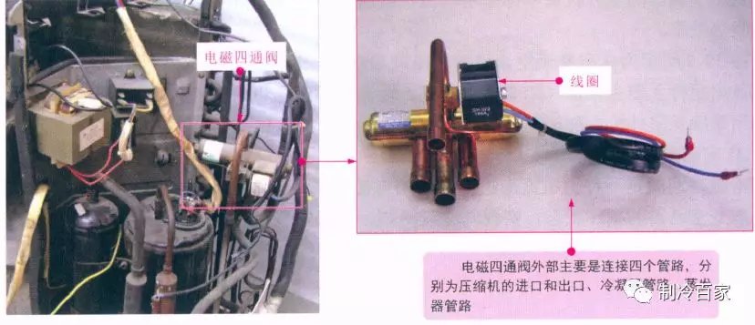 电磁四通阀是一种由电流来进行控制的电磁阀门,该器件主要用来控制制冷剂的流向, 从而改变空调器的工作状态,实现制冷或制热,通常安装在变频压缩机附近,且与变频压缩 机的进出口连接。