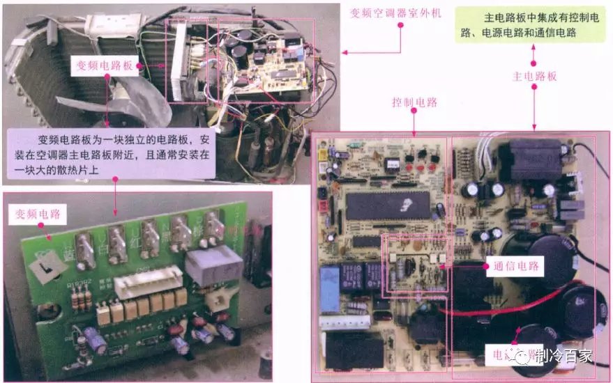 可以看到,变频空调器室外机的变频电路通常为一块独立的电路板,而主电路板上通常 集成有控制电路、电源电路和通信电路。