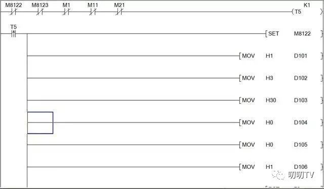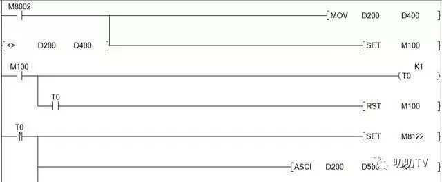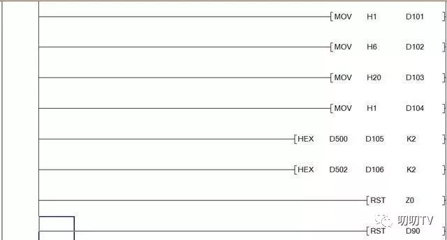 写入数据 M8122是送信指令, 表示在发送信息,ASCI D200 D500 K4.D200为频率数据, 将D200数据转换成ASCII, 例如D200=0ABCH,K4就表示D500=0,D501=A,D502=B,D503=C,只转换4位。 D101站号,D102功能码,D103D104功能码高低位地址,D105D106数据内容。 根据变频器的MODBUS功能, 我们知道写入频率的地址是2001H, 因此高位20H传到D103,低位01H传到D104,然后将频率值传送到D105D106, 传送完毕LRC值复位。 这样就完成了写的功能, 变频器的正反停功能根据上表依次编程。 6.4 读取数据 由于采用半双工工作, 写入和读取不能同时进行,