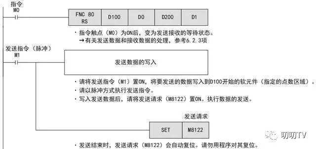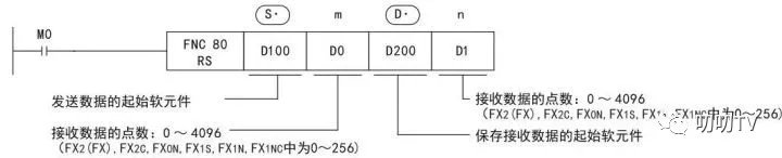 RS举例 RS指令用于指定从FX可编程控制器发出的发送数据的起始软元件和数据点数, 以及保存接收数据的起始软元 件, 和可以接收的最大点数,编程按照下列要领:
