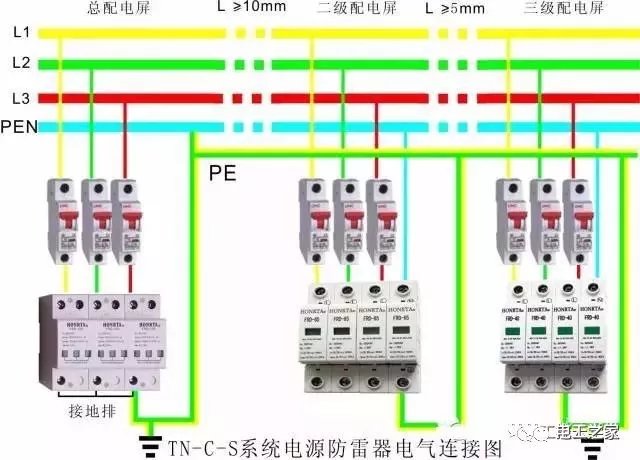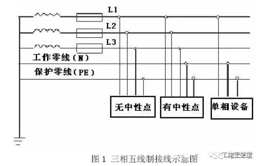 (R 黄、S绿、T红、N蓝或黑、地黄加绿双色线)三相五线制 (R 黄、S绿、T红、N蓝或黑色线、)三相四线制 (R 黄、S绿、T红、地黄加绿双色线)三相四线制 三相四线制:相线A、B、C,保护零线PEN,PEN线上有工作电流通过,PEN在进入用电建筑物处要做重复接地;属于TN-C接地系统. 三相五线制:相线A、B、C,零线N,保护接地线PE,N线有工作电流通过,PE线平时无电流(仅在出现对地漏电或短路时有故障电流);我国民用建筑的配电方式采用TN-S接地系统。 二、三相四线制为何三相五线制多一根线 低压配电网电缆中,输电线路一般采用三相四线制,其中 三相四线制 三条线路分别代表A,B,C三相,另一条是中性线N称三相四线制, 三相五线制包括三相电的三个相线(A、B、C线)、中性线(N线);以及地线(PE线),因此区别为多了一条地线。 三相五线制比三相四线制多一根地线,用于安全要求较高,设备要求统一接地的场所。 三相五线制的学问就在于这两跟"零线"上,在比较精密电子仪器的电网中使用时,如果零线和接地线共用一根线的话,对于电路中的工作零点会有影响的,虽然理论上它们都是0电位点,如果偶尔有一个电涌脉冲冲击到工作零线,而零线和地线却没有分开,比如这种脉冲却是因为相线漏电引起的,再如有些电子电路中如果零点飘移现象严重的话那么电器外壳就可能会带电,可能会损坏电气元件的,甚至损坏电器,造成人身安全的危险. 零线和地线的根本差别在于一个构成工作回路,一个起保护作用叫做保护接地,一个回电网,一个回大地,在电子电路中这两个概念是要区别开来的,在正规公司里,这两根线规定要分开接. 现在实际中还有一种三相六线的接法,除工作零线,保护接地外,还专门另配一路接地线,这根线跟设备地线分开来接,不与其他任何线相接,用做对仪器设备的保护,因为电气件的损坏往往只几微秒的时间,所以要将误动作电流更快的引回大地,需要仪器直接接地. 在同一用电系统中,绝对不允许同时存在保护接地与保护接零。 在三相四线制制供电系统中,把零干线的两个作用分开,即一根线做工作零线(N),另外用一根线专做保护零线(该结线的点是: 工作零线N与保护零线PE除在变压器中性点共同接地外,两线不再有任何的电气连接。由于该种结线能用于单相负载,没有中性点引出的三相负载和有中性点引出的三相负载,因而得到广泛的应用。在三相负载不完全平衡的运行情况下,工作零线N是有电流通过且是带电的,而保护零线PE不带电,因而该供电方式的接地系统完全具备安全和可靠的基准电位。 三、三相五线制供电的原理 三相五线制供示意图 众所周知,在三相四线制电线电缆供电中由于三相负载不平衡时和低压电网的零线过长且阻抗过大时,零线将有零序电流通过,过长的低压电网,由于环境恶化,导线老化、受潮等因素,导线的漏电电流通过零线形成闭合回路,致使零线也带一定的电位,这对安全运行十分不利。在零干线断线的特殊情况下,断线以后的单相设备和所有保护接零的设备产生危险的电压,这是不允许的。如采用三相五线制供电方式,用电设备上所连接的工作零线N和保护零线PE是分别敷设的,工作零线上的电位不能传递到用电设备的外壳上,这样就能有效隔离了三相四线制供电方式所造成的危险电压,使用电设备外壳上电位始终处在“地”电位,从而消除了设备产生危险电压的隐患。 四、对三相五线制敷设的要求 (1) 在用绝缘导线布线时,保护零线应用黄绿双色线,工作零线一般用黑色线。沿墙垂直布线时,保护零线设在最下端,水平布线时,保护零线在靠墙端。 (2) 在电力变压器处,工作零线从变压器中性瓷套管上引出,保护零线从接地体的引出线引出。 (3) 重复接地按要求一律接在保护零线上,禁止在工作零线上重复接地。 (4) 采用低压电缆供电时应选用五芯低压电力电缆。 (5) 在终端用电处(如闸板、插座、墙上配电盘等)工作零线和保护零线一定分别与零干线相连接。 (6) 对老企业的改造应逐步实行保护零线和工作零线分开的办法。例如在车间入户时零干线做重复接地,重复接地以后工作零线单独敷设,保护零线由此重复接地体引出;使用四极漏电保护断路器的,在断路器前是三相四线制,在断路器后改为三相五线制; 在架空线路供电又实行动力电和照明电分开架设的(两棚线),可以用随照明线横担架设的零线为工作零线,随动力线横担架设的零线做保护零线。 五、三相五线制供电的应用范围 凡是采用保护接零的低压供电电线系统,均是三相五线制供电的应用范围。国家有关部门规定:凡是新建、扩建、企事业、商业、居民住宅、智能建筑、基建施工现场及临时线路,一律实行三相五线制供电方式,做到保护零线和工作零线单独敷设。对现有企业应逐步将三相四线制改为三相五线制供电,具体办法应按三相五线制敷设要求的规定实施 .