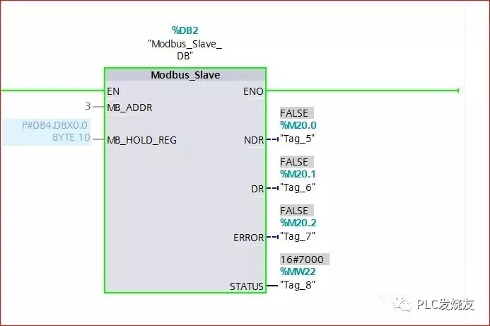 上述是主站的总结 接下来说一下从站的设置: 前面参数和主站是一样的,就是调用MODBUS SLAVE需要说明一下: MB_ADDR: MODBUS 的从站地址