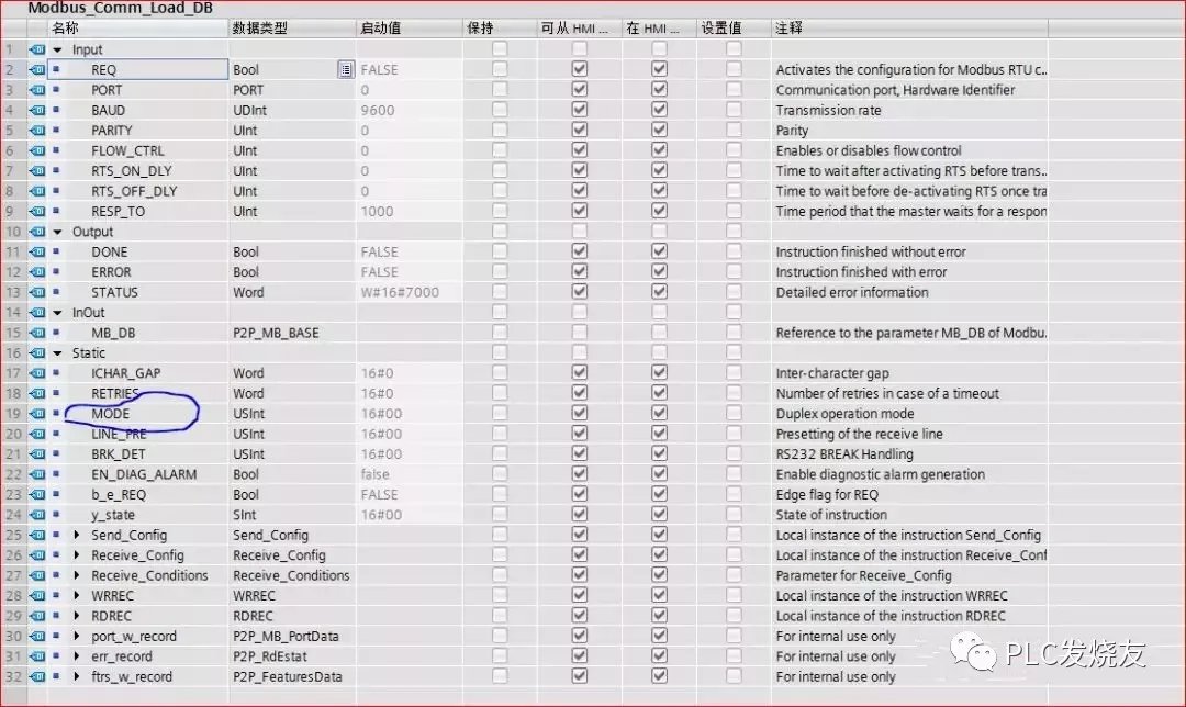 管脚说明如下所示: REQ;是脉冲信号,给一次脉冲,收发一次 MB_ADDR:是从站地址 MODE:读写模式,0是读,1是写 DATA_ADDR:对应功能码 LEN:数据长度 DATA_PRA:接收或发送的存储区域 上述是模式和功能码的对应关系 除上述做法,还需要设置一个地方: 打开MODBUS COMMON LOAD的背景数据块,如下所示: 将MODE 设置成4
