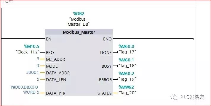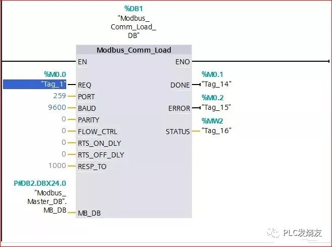 管脚说明: REQ: 指令起始于上升沿(0 到 1)。 PORT: 安装并组态完 CM 后,便可在设备组态的“硬件 ID”(Hardware ID) 属性中找到 CM 端口值。符号端口名称在 PLC 变量表的“系统常数”(System constants) 选项卡中指定。就是前面提到的硬件标识符 BAUD: 选择数据传输速率: 1 = 300, 2 = 600, 3 = 1200, 4 = 2400, 5 = 4800, 6 = 9600, 7 = 19200, 8 = 38400, 9 = 57600, 10 = 76800, 11 = 115200 bit/s。所有其它值无效。 PARITY: 选择奇偶校验: · 0 – 无 · 1 – 奇校验 · 2 – 偶校验 RESP_TO: 响应超时: 5 ms 到 65535 ms - Modbus_Master 等待从站响应的时间(以毫秒为单位)。如果从站在此时间段内未响应,Modbus_Master 将重复请求,或者在指定数量的重试请求后取消请求并提示错误(请参见下文,RETRIES 参数)。 MB_DB:用MODBUS MASTER的背景数据块里面的一部分,如下所示: 对 Modbus_Master 或 Modbus_Slave 指令的背景数据块的引用。必须以 Modbus_Master 或 Modbus_Slave 指令的 MB_DB 参数替换 MB_DB 参数(静态,因此在指令中不可见)。 然后调用MODBUS MASTER 的功能块,如下所示: