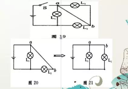 等效电路又称“等值电路”。在同样给定条件下,可代替另一电路且对外性能不变的电路。电机、变压器等电气设备的电磁过程可用其相应的等效电路来分析研究。 等效电路是将一个复杂的电路,通过电阻等效、电容等效,电源等效等方法,化简成具有与原电路功能相同的简单电路。这个简单的电路,称作原复杂电路的等效电路 。 等效电路图的画法步骤 1、认真审题,在草稿纸上画出原图,并把开关的状态、滑动变阻器的滑片所处的位置依题意画下; 2、根据电流路径的优先走法,把没有电流经过的元件用橡皮擦擦掉,同时将断开的开关及与其串联的元件与擦掉,闭合的开关用导线代替; 3、正确分析电路的连接方式,明确电流表测哪部分电路的电流,电压表测谁的电压,再将电路图整理,即画出了等效电路图; 4、把已知条件尽可能标注在等效电路图上; 5、找出所求的物理量与哪个等效图对应,然后根据串、并联电路的特点,特别注意电源电压不变,定值电阻的阻值不变,正确运用电学公式来分析解答。 等效电路画图的技巧 第一种方法叫首尾相接法,如果是全都是首尾相连就一定是串联,如果是首首相连,尾尾相接,就一定是并联。如果是既有首尾相连,又有首首相连,则一定是混联。 第二种方法叫电流流向法,根据电流的流向,来判断和串并联的特点,来判断串联、并联和混联电路。 第三种方法,叫手捂法,含义是任意去掉一个用电器,其他用电器都不能工作的一定是串联;任意去掉一个用电器,其他用电器都能工作就一定是并联;任意去掉一个用电器,其他用电器部分能工作的一定是混联。 第四种方法,叫节点法 1、标出等势点。依次找出各个等势点,并从高电势点到低电势点顺次标清各等势点字母。 2、捏合等势点画草图。即把几个电势相同的等势点拉到一起,合为一点,然后假想提起该点“抖动”一下,以理顺从该点向下一个节点电流方向相同的电阻,这样逐点依次画出草图。画图时要注意标出在每个等势点处电流“兵分几路”及与下一个节点的联接关系。 3、 整理电路图。要注意等势点、电阻序号与原图一一对应,整理后的等效电路图力求规范,以便计算。 等效电路图的八种画法详解 1、伸缩导线法 若导线上两点间无用电器连接,则可将这两点间的导线伸长或缩短,甚至可缩成一点。 例1:把图1电路改画成串。并联关系明显的等效电路。 解析:因B与D两点.A与C两点间无用电器,故可将BD、AC导线缩短:先将导线BD缩成一点得图2电路,再将导线AC缩成一点得图3电路,最后经处理可得等效电路如图4. 2、拽拉导线法 将电路中的连接点向上向下、向左向右拽拉,再经处理即可得串、并联关系明显的等效电路。 例2 :把图5电路改画成串。并联关系明显的等效电路。解析 将A点先向上拉再向左拉,将B点先向下拉再向右拉得图6电路;再经处理可得图7即题中所求电路。 3、合并节点法 不论导线有多长,只要其间没有连接电源、用电器,则导线两端点都可看成一点,从而找出各用电器两端的公共点。此法可用于识别不规范的电路。 例3:把图8电路改画成串、并联关系明显的等效电路。 解析:因AC和BD两导线上都没有连接用电器,故可把AC和BD导线看作A和B两个点处理;进而可知四个电阻并联在A、B两点之间,将这四个电阻并联接在A、B两点之间、使其作为电阻公共点即可得图10所示题中所求电路。 4、移动节点法 一个节点可从导线上的一处移到另一处,但不可越过电源、用电器。 例4:把图11电路改画成串、并联关系明显的等效电路。 解析:将节点A向左移到左侧导线上,将节点B向右移到右侧导线上,所得图12电路即题中所求。 例5 :将图13电路改画成申、并联关系明显的等效电路。 解析 将节点A向上移,将节点B向下移,得图14电路即为图中所求。 5、元件拆除法 拆除法是识别较复杂电路的一种重要方法: 串联电路一拆除一段电路上的用电器后,其他路段上的用电器不能正常工作。 并联电路---拆除其中一条支路上的用电器后,其他支路上的用电器仍能正常工作。 例6:把图15电路改画成串、并联关系明显的等效电路。 解析:L1拆除后得图16电路:L2拆除后得图17电路:L3拆除后得图18电路:分析三 图可知,无论拆除哪个灯泡其余灯泡均可正常发光,因此三灯是并联关系,再接着画等效电路图就不难了。 6、简化电路法 把断开的开关或被短路的用电器去掉的方法叫简化电路法。 例7:把图19电路改画成串、并联关系明显的等效电路。 解析:去掉S.L3简化后得图20电路,拉拽导线后得图21电路即为所求。 7、电表摘补法 对于有电表的电路可采取电表摘补法分析:把电压表换文字内容连接处看成断路,电流表连接处看作一根导线。由于导线、开关、电流表的阻值很小,所以在电路中可以把电压表两端导线在电路中进行等效移动,在移动中电压表两端导线可以跨过电路中任何导线、开关、电流表等电阻值很小的元件,而几乎不影响电压表的读数。 例8:把图22电路改画成串、并联关系明显的等效电路。 解析:电压表处看成断路,电流表处看作一根导线,摘掉电压表和电流表,得图23电路;将导线拉直,再补接上电压表和电流表所得图24电路即为所求。 用电压表测电压时测的是电路两端电压,但在某些接有电压表的电路中电压表测的究竟是哪部分电路的电压,有部分学生始终弄不明白,这一问题也可以用画等效电路图的方法来解决