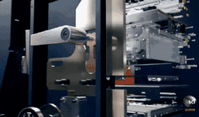 首先,是通过光电传感器测量硬币直径尺寸,第一次鉴别硬币种类;之后硬币滚动经过金属探测传感器,由于不同材质金属反射电磁波的相位延迟也不同,这样就可以对硬币种类进行进一步鉴别。 如果两次均无法鉴别,硬币就会进入退币槽,吐出机器,而鉴别成功的硬币在区分出不同的面额后分流滚入不同滑道进行存储。 2.食品掉落 原理:当售货机收到掉落某种食品的指令后,固定在不同食品栏后的单个伺服电机转动预先设定的圈数,正好使卡位弹簧前进一个食品位置的行程,食物在掉落的过程中会经过红外传感光束,这就完成了一次掉落。 如果系统一直没有检测到食物经过红外传感光束,这就有可能是该位置的食品出现了漏放,那系统将会让伺服电机再次运行,直至食品掉落。
