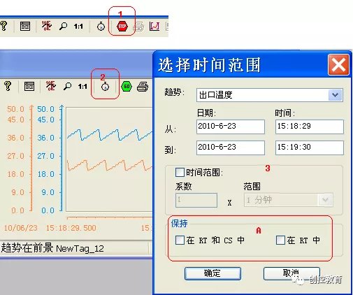 图7系统运行后,在趋势控件工具栏上点击“开始/停止”按钮停止数据更新。然后点击“选择时间范围”按钮,在弹出对话框中先取消“时间范围”复选框,然后填写开始时间/结束时间(图8),最后点击确定。 2)在线表格控件手动查询