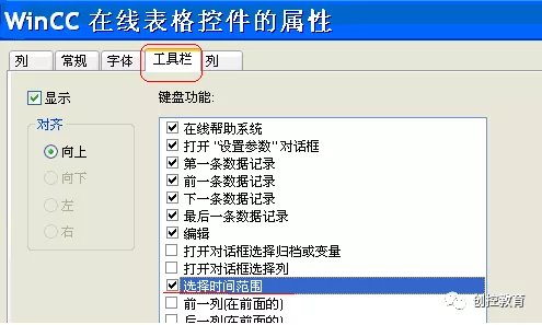在组态画面中双击在线表格控件,在“WinCC在线表格控件的属性”对话框中选择“工具栏”,把“选择时间范围”勾选上,保存设置(图9)。