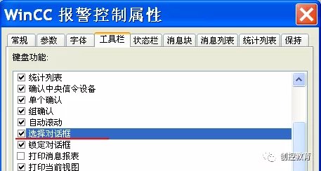 在组态报警控件时双击控件,在“WinCC报警控制属性”对话框中选择“工具栏”,把“选择对话框”勾选上(图3),保存设置。
