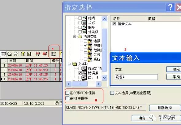 图4图中区域A中参数选项的含义请参考(表1) 设置 含义 无设置 下次切换画面时,所做组态将丢失。 “在CS和RT中保持” 即使关闭和重启系统,所做的组态仍然保持。 “在RT中保持” 所作组态一直保持到系统终止运行。 表1 1.2 使用脚本对报警控件做查询