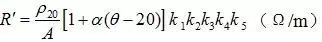 S——线芯中心轴间距离,m; ks——线芯结构常数,分割导体ks=0.435,其他导体ks=1.0; kp——线芯结构系数,分割导体kp=0.37,其他导体kp= 0.8~1.0; 对于使用磁性材料制做的铠装或护套电缆,Yp和Ys应比计算值大70%,即: R=R′[1+1.17(YS+YP)]