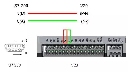 3.3 用电缆将S7-200 Port 0端口与V20的RS485接口相连(注意端口连接规则:V20的 P+对3、N-对8),如下图所示: