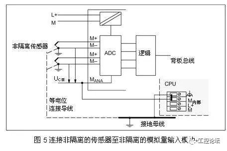 如果工厂接地不好,最好还是使用隔离的传感器。 06 使用非隔离的模拟量模块连接非隔离的传感器 如果使用非隔离的模拟量连接非隔离的传感器,那么一定将所有的点接地并进行等电位处理。典型接线如图5所示:  从图5可以看到,按照隔离与非隔离的要求,模块不隔离,必须连接MANA与地M,传感器不隔离则需要连接信号负端到本地的地,这样一边以信号源的地作为基准点,一边以模块的地M作为基准点,为了消除两者之间的电位差(共模电压UCM),需要使用足够粗的导线进行等电位连接。
