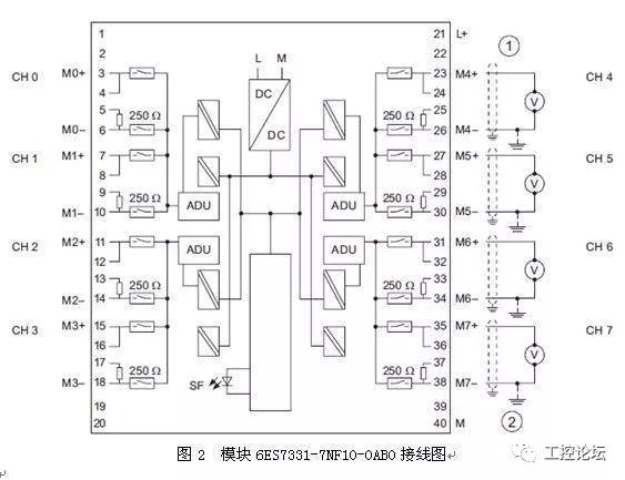 有的模块通道组间都是隔离的,没有MANA ,例如模块6ES7331-7NF10-0AB0,接线如图2所示:  这时每一个通道组(每组2通道)的M-就是MANA ,输入通道组间UCM 最大为以达到75VDC。