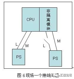 讲了一系列的接线方式,最终的结论就是模拟量接线的几种方式都集中在一点上,就是信号源端与测量端一定要等电位。  讲到这里我觉得还是要再扩展一下,利用这个原则同样也可以解决数字量接线问题。下面是在现场遇见的一个问题,如图6所示,CPU与I/O的供电分开,I/O是一个非隔离模块,当现场给出信号,但是I/O模块的输入灯没有点亮,在CPU中也不能读出,使用万用表测量,在端子上有24V电压。模块没有问题,将两个电源PS的M端短接,就可以检测到输入信号,这也是由于参考点电位不同造成的。希望一点小小的提示可以帮助大家解决现场模拟量接线的问题。