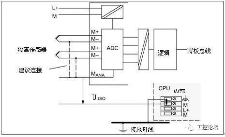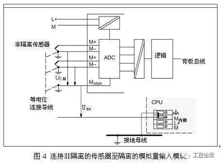 都隔离的情况下连接信号负端与MANA 端就可以了(2线制和电阻测量除外)。手册每个模块接线图中MANA都是建议接地的,我认为这是在接地良好、不会产生共模电压(例如单端接地)的情况下。 04 使用非隔离的模拟量模块连接隔离的传感器 这回我来讲讲使用非隔离的模拟量模块连接隔离的传感器的情况,模块的MANA与地M不隔离,这样必须连接MANA与地M,模拟量的参考点电位变成地M,典型接线如图3所示:  非隔离的模块都要求连接连接MANA与地M,例如模块SM334(6ES7334-0CE01-0AA0),在提示中强调必须连接,下面为引用手册的提示部分。