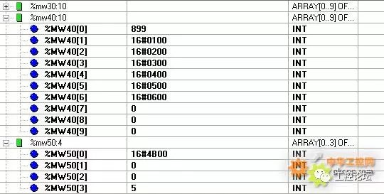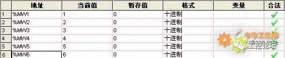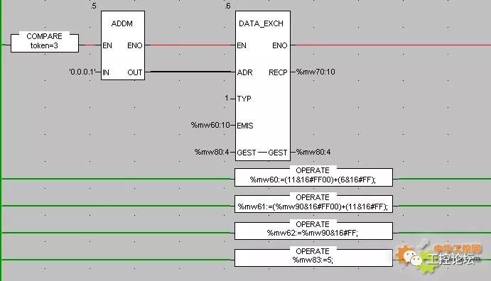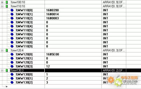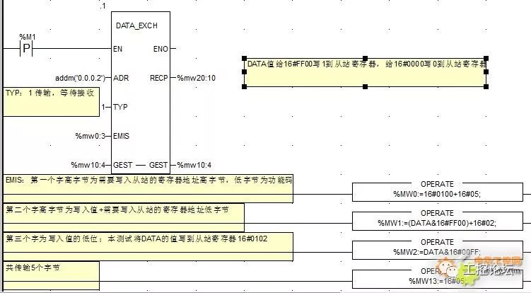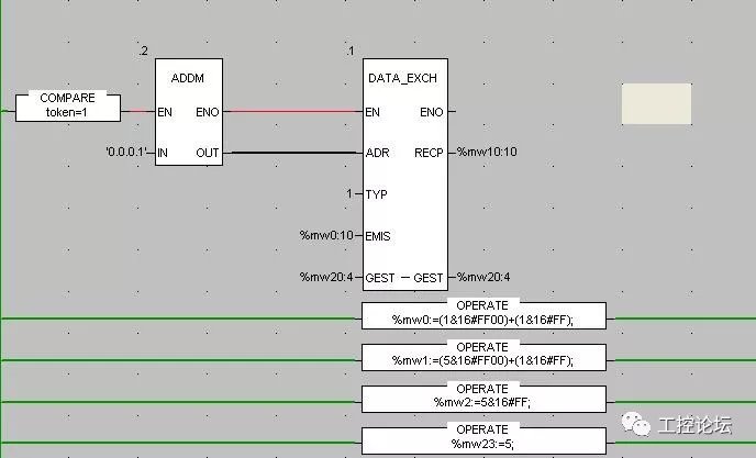 在主站赋值如下  在TWIDO中显示如下  另外注意刷新数据时,必须要把EN引脚断开一下才可以重新读取或写入。通过实验,把交换管理表的完成位(即GEST第一个字的最低位)放在EN引脚前不太好使,所以最好编个令牌循环指令。把令牌放在EN引脚前,当取得令牌时再读取或者写入。  功能码05:
