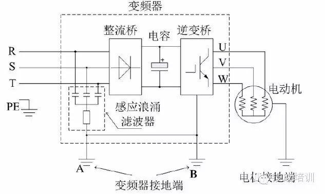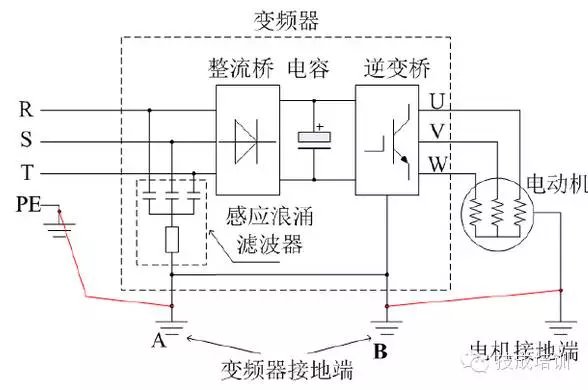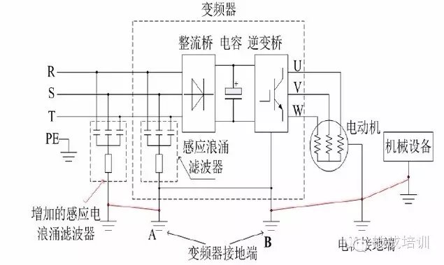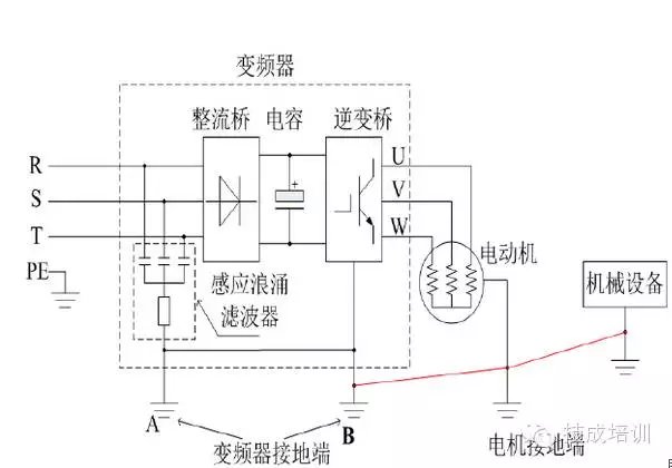 1、漏电问题产生的原因 在有的现场使用变频器控制电机会出现漏电问题,漏电电压有几十伏到200伏不等,在这里针对此故障的原因进行理论的分析和说明如下。 ![]() 根据变频器控制电机运行的功能图(图1)三相电经过整流经滤波电容供电给逆变桥(IGBT),再经逆变器输出频率、电压可调的三相电去控制电机的运行。 我们都知道电动机的三相定子绕组流过电流产生旋转磁场,根据磁电感应的原理,电动机的外壳就会产生感应电动势,此电动势的大小就取决于变频器IGBT的开关频率的大小,由于高性能的控制要求高的开关频率,其开关速度很快,则DV/DT偏大,同时这个感应电动势就偏大,人触摸上就有电击的感觉。理论上IGBT的开关速度越快,电机外壳上的感应电动势就越高,而变频器对电机的控制精度和响应就越高,人触摸之后被电的感觉就越高,反之,IGBT的开关频率慢,感应电就小,人触摸的感觉就小,所以国内的低端变频器设计的开关频率偏低,控制电机后感应电小,人摸上没啥感觉,但其控制性较差,动态响应较慢。我司的变频器性能和动态响应都较好,因而我司的IGBT的开关频率和速度都较高,感应电动势相应会大些。因为工频运行电机是的频率只有50HZ,所以一边情况下不会有漏电的感觉,而变频控制时,开关频率很高,电机外壳就会有漏电的感觉。 2、漏电问题的解决方案 为了避免这个问题的发生,在硬件设计的时候,就加入了感应电浪涌滤波器电路(其等效电路如图1所示),并将浪涌滤波器的接地端于变频器的外壳相连,同时在变频器的配线说明中,要求将电机的接地端同变频器的接地B相连,将输入电源的地(大地)同变频器的接地A相连,从而使电机的感应电通过电机与变频器的接地和变频器与电源的接地线形成回路,使电机的地变频器的地和电源的地在同一电位上,他们之间的电位差是为0伏电压,这样人站在大地上面接触到电机的外壳、设备的机架、变频器的外壳就不会有被电的感觉了。 ![]() 但是有些工厂内为了配线方便,高压配电房内没有把地线拉入车间,甚至错误的认为大地就是地线,这种想法是错误的,大家不妨想一想,如果大地可以当地线,那我们日常生活中何必拉N线盒地线呢?发电站里的N线也是和地线连在一起的啊?我们不用拉N线盒地线不是省很多电线吗?为啥浪费人力、物力、时间呢?然而现实中有很多工厂没有拉电源地线的,设备没法找到接地点,而电机在使用中却有感应漏电的情况,遇到这种情况,我们提供两种方案: 方案1:将电机的接地端、机架外壳、变频器的接地端接在一起 ![]() (图3) 电机、变频器、机架三个电线连在一起之后,使他们处于同一电位,并经过变频器内部的浪涌吸收、泄放,使感应电压大大减小,这样不至于让人又触电的感觉,也就是说没有地线也没有关系,只要就几个的地连在一起就好了,这样变频器内部的浪涌滤波器才起作用到作用。 方案2:一般情况下经过方案1的处理,不至于会有电人的现象,但由于特殊的原因,感应电压还是比较高,还可以电人,那就在方案1的前提下再在变频器的输入电源端增加一个感应电浪涌滤波器。 ![]() (图4) 并将感应电浪涌滤波器的地与电动机的地、变频器的地接在一起(如图4中的红色线所示)让感应电浪涌滤波器再一次对电机的感应电进行吸收和泄放,进一步减小感应电压,达到防止漏电电人的目前的。增加的感应电浪涌滤波器的电路原理与变频器内部的浪涌滤波电路是一样的,是由于体积太大,没法设计安装在变频器内部电路里面,因此做成外接方式。 我们曾经过大量的实验证明,通过方案二这种接法的现场整改,在没有接电源的地线的应用场合下,都能将电动机运转产生的感应电压减小到20V以下,确保现场操作人员的安全,不会再有被漏电电人的感觉。但是,方案二中如果接有电源线的地线,那么也就不用外接感应电浪涌滤波器都可以了。 另外,如果现场是有多台变频器控制电动机运转时,且不方便安装多个感应电浪涌滤波器的,并不一定是要求每台变频器都配一下感应电浪涌滤波器,也可以只接一个或两个感应电浪涌滤波器,并将滤波器的接地端与现场几台变频器的接地端、现场电动机的接地端、设备机架接在一起,如图5所示:由于每台变频器内部都有感应电浪涌滤波器电路,但如果电机的接地线没有接回到变频器的接地端子去的话,感应电浪涌滤波器也就不起作用了,所以现场应用中电动机的接地端一定要与变频器的接地端接到一起。当然有些设备在某些场合电机不接地线也不会有漏电的感觉,这与本文前面所说的“大地虽然也是属于导体,但大地毕竟是有阻值的,而且根据不同的土地的土壤成份,阻值也大小不一”原理是一样的。但是按照正确的用电安全规范,是要求电机良好接地的,但条件不允许(如没有电源接地端)的,电动机的地、电柜外壳与变频器的地总可以接在一起的。 ![]() |