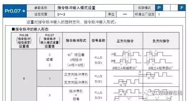 伺服控制脉冲输入方式。PLC发送高速脉冲给伺服驱动器,有几种方式,可以是正转一路脉冲,反转一路脉冲;也可以是只用一路脉冲,而增加一个方向控制信号(高低电平即可),当然也可以是90°相位差的2相脉冲,Pr0.07分别设为“1”、“3”、“0”或“2”。可以看出除了设置为“3”只需一路脉冲就可实现定位控制,其他三者都需要两路脉冲,对于一个轴控制(即一套伺服系统)三菱PLC都没有问题,如果是两个轴控制,则必须将Pr0.07设置为“3”,缺省值为“1”,因此此参数一般都需要设置。当然此参数与Pr0.06配合设置,可选择输入的脉冲极性。 ![]()