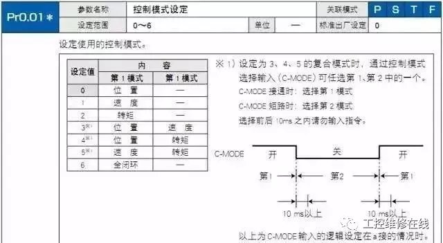 伺服控制模式的设置。位置控制是缺省模式(Pr0.01=0),其他模式设置可参考如下: ![]()