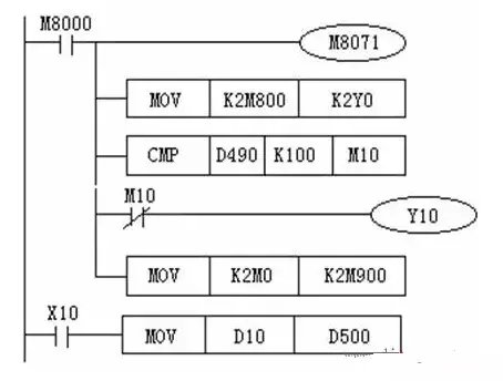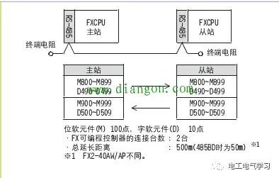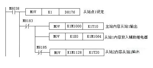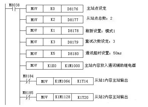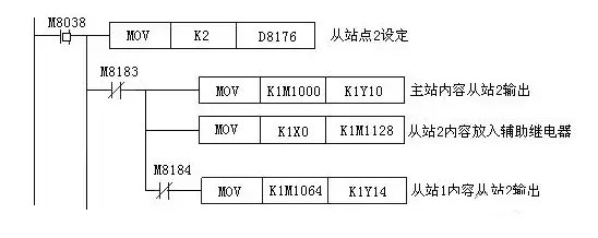 三菱FX系列PLC作为三菱基本的PLC,它们之间的通讯有几种常用的方式,分别如下:CC-LINK,N:N网络连接,并联连接。 1.CC-LINK连接 CC-LINK连接图如下: ![]() 对应的PLC可为FX1N、FX1NC、FX2N、FX2NC、FX3U、FX3UC,因为在使用CC-LINK通讯时要扩展CC-LINK模块,而FX1S没有扩展模块功能,故FX1S不能用于此通讯方式。 2)FX1N/FX2N/FX3U即可以作为主站,也可以作为远程设备站使用。 此种通讯因为要加CC-LINK通讯模块,所以成本较高。 3)在CC-LINK网络中还可以加入变频器伺服等符合CC-LINK规格的设备。 2.N:N网络连接 N:N网络连接连接图如下: ![]() 3.并联连接 并联连接图如下: ![]() 1) 通讯对象是FX1S、FX1N、FX1NC、FX2N、FX2NC、FX3U、FX3UC同一系列的PLC之间。 2) 该通讯在PLC间进行1:1通讯,进行数据交换,只能满足2台PLC的通讯。 一、N:N网络通讯 1、通讯解决方案 用FX2N,FX2NC,FX1N,FXON可编程控制器进行的数据传输可建立在N:N的基础上。使用此网络通讯,它们能链接—个小规模系统中的数据。 2、相关标志和数据寄存器 对于FXlN/FX2N/FX2NC类可编程控制器,使用N:N网络通讯辅助继电器,其中M8038用来设置网络参数, M8183在主站点的通讯错误时为ON, M8184到M8190在从站点产生错误时为ON,(第1个从站点M8184,第7个从站点M8190) M8191在与其它站点通讯时为ON 数据寄存器D8176设置站点号,0为主站点,1到7为从站点号D8177设定从站点的总数,设定值1为1个从站点,2为两个从站点;D8178设定刷新范围,0为模式0(默认值),1为模式1,2为模式2;D8179 主站设定通讯重试次数,设定值为0到10;D8180 设定主站点和从站点间的通讯驻留时间,设定值为5到255,对应时间为50到2550ms 案例 该系统有三个站点,其中一个主站,两个从站,每个站点的可编程控制器都连接一个FX2N-485-BD通讯板,通讯板之间用单根双绞线连接。刷新范围选择模式1,重试次数选择3,通信超时选50ms,系统要求: ①主站点的输入点X0到X3输出到从站点1和2的输出点Y10到Y13。 ②从站点1的输入点X0到X3输出到主站和从站点2的输出点Y14到Y17。 ③从站点2的输入点X0到X3输出到主站和从站点1的输出点Y20到Y23。 主站点的梯形图编制 ![]() 从站点1的梯形图编制 ![]() 从站点2的梯形图编制 ![]() 二、并行链接通讯 1、并行通讯解决方案 用FX2N,FX2NC,FX1N,FX和FX2C可编程控制器进行数据传输时,是采用100个辅助继电器和10个数据寄存在 1:1的基础上来完成。FXlS和FXON的数据传输是采用50个辅助继电器和10个数据寄存器进行的。 2、使用方法 当两个FX系列的可编程控制器的主单元分别安装一块通讯模块后,用单根双绞线连接即可,编程时设定主站和从站,应用特殊继电器在两台可编程控制间进行自动的数据传送,很容易实现数据通讯连接。主站和从站的设定由M8070和M8071设定,另外并行连接有一般和高速两种模式,由M8162的通断识别。 3、通讯实例 在并行通讯系统中,控制要求如下: ①主站点输入X0到X7的ON/OFF状态输出到从站点的Y0到Y7。 ②当主站点的计算结果(D0+D2)大于100,从站的Y10通。 从站点的M0到M7的ON/OF状态输出到主站点的Y0到Y7。 从站点中D10的值被用来设置主站点中定时器。 主站点梯形图 ![]() 三、计算机链接 小型控制系统中的可编程控制器除了使用编程软件外,一般不需要与别的设备通讯。可编程控制器的编程器接口一般都是RS-422或RS-485,而计算机的串行通讯接口是RS-232C,编程软件与可编程控制器交换信息时需要配接专用的带转接电路的编程电缆或通讯适配器,例如为了实现编程软件与FX系列plc之间的程序传送,需要使用SC-09编程电缆。 四、无协议通讯 大多数可编程控制器都有一种串行口无协议通讯指令,如FX系列的RS指令,它们用于可编程控制器与上位计算机或其它RS-232C设备的通讯。这种通讯方式最为灵活,可编程控制器与RS-232C设备之间可以使用用户自定义的通讯规定,但是可编程控制器的编程工作量较大,对编程人员的要求较高。如果不同厂家的设备使用的通讯规定不同,即使物理接口都是RS-485,也不能将它们接在同一网络内,在这种情况下一台设备要占用可编程控制器的一个通讯接口。 用各种RS232C单元,包括个人计算机,条形码阅读器和打印机,来进行数据通讯,可通过无协议通讯完成,此通讯使用RS指令或一个FX2N-232IF特殊功能模块完成。 五、可选编程端口通讯 现在的可编程终端产品(如三菱的GOT-900系列图形操作终端)一般都能用于多个厂家的可编程控制器。与组态软件一样,可编程终端与可编程控制器的通讯程序也不需要由用户来编写,在为编程终端的画面组态时,只需要指定画面中的元素(如按钮、指示灯)对应的可编程控制器编程元件的编号就可以了,二者之间的数据交换是自动完成的。 对于FX2N,FX2NC,FX1N,FXlS系列的可编程控制器,当该端口连接在FX2N-232-BD,FXON—32ADP,FX1N—232—BD,FX2N-422—BD上时,可支持—个编程协议。 ![]() |
