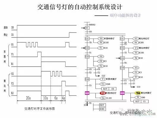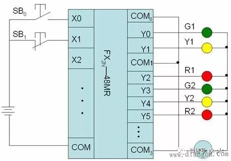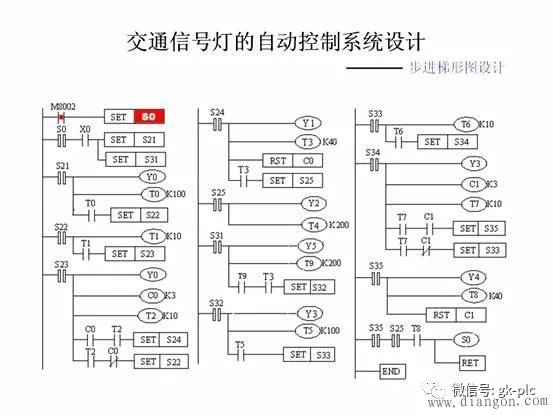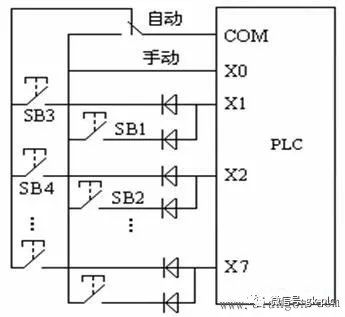 一、 可编程控制器系统设计的步骤和内容 案例:交通信号灯的自动控制系统设计 1、信号转换关系 ![]() 2、交通等演示图 ![]() 3、分析工况,思考问题: 1.该控制系统是否属于顺序控制?是哪种结构? 2.该控制系统工作步如何划分?共有多少工作步? 3.输入/输出信号有那些? 4、plc的I/O分配 ![]() 5、PLC硬件设计 ![]() 6、PLC顺序功能图设计 ![]() 7、PLC梯形图程序设计 ![]() 8、综述PLC系统设计的步骤 1)熟悉控制对象的工艺要求(工况分析) 2)电器控制线路的设计 3)程序设计 4)控制系统模拟调试 5)现场调试 6)技术文件整理 二、 可编程控制器的选型与硬件配置 (一)选择合适的可编程控制器类型 1、可编程控制器选择 三菱FX1S系列可编程控制器是一种卡片大小的PLC,适合在小型环境中进行控制。它具有卓越的性能、串行通讯功能以及紧凑的尺寸,这使得它们能用在以前常规可编程控制器无法安装的地方。 三菱FX1N系列可编程控制器是一种普遍选择方案,最多可达128点控制。由于FX1N系列具有对于输入/输出、逻辑控制以及通讯/链接功能的可扩展性,因此它对普遍的顺控解决方案有广泛的适用范围,并且能增加特殊功能模块或扩展板。 三菱FX2N系列可编程控制器是FX系列中最高级的模块。它拥有无以匹及的速度、高级的功能、逻辑选件以及定位控制等特点,FX2N是从16到256路输入/输出的多种应用的选择方案。 三菱FX2NC系列可编程控制器在保留其原有的强大功能特色的前提下实现了极为可观的规模缩小,I/O型连接口降低了接线成本并节省了时间。 对于开关量控制的系统,当控制速度要求不高时,一般的小型整体机FX1S就可以满足要求。对于以开关量控制为主,带有部分模拟量控制的应用系统,应选择具有所需功能的可编程控制器主机,如用FX1N或FX2N型整体机。另外还要根据需要选择相应的模块,例如开关量的输入/输出模块、模拟量输入/输出模块、配接相应的传感器及变送器和驱动装置等。 2、I/O点数的确定 一般的讲,可编程控制器控制系统的规模的大小是用输入、输出的点数来衡量的。我们在设计系统时,应准确统计被控对象的输入信号和输出信号的总点数并考虑今后调整和工艺改进的需要,在实际统计I/O点数基础上,一般应加上10%一20%的备用量。 对于整体式的基本单元,输入输出点数是固定的,不过三菱的FX系列不同型号输入/输出点数的比例也不同,根据输入/输出点数的比例情况,可以选用输入/输出点都有的扩展单元或模块,也可以选用只有输入(输出)点的扩展单元或模块。 3、用户存储器容量的估算 根据经验,对于开关量控制系统,用户程序所需存储器的容量等于I/O信号总数乘以8。对于有模拟量输人输出的系统,每一路模拟量信号大约需100存储器容量。如果使用通信接口,那么每个接口需300存储器容量。一般估算时根据算出存储器的总字数再加上一个备用量。 4、可编程控制器的处理速度应满足实时控制的要求 可编程控制器是采用顺序扫描的工作方式,其顺序扫描工作方式使它不能可靠地接收持久时间小于1个扫描周期的输入信号。为此,对于快速反映的信号需要选取扫描速度高的机型 关于可编程控制器的选型问题,当然还应考虑到它的的联网通信功能、价格等因素。系统可靠性也是考虑的重要因素。 (二)开关量输入输出模块及扩展的选择 开关量输入模块的输入电压一般为DC24V和AC220V两种。直流输入可以直接与接近开关、光电开关等电子输入装置连接,三菱FX系列直流输入模块的公用端已经接在内部电源的0V,因此直流输入不需要外接直流电源,有些类型的可编程控制器输入的公用端要另接电源,对初学者应该注意。交流输入方式的触点接触可靠,适合于在有油雾、粉尘的恶劣环境下使用。我们最常用的还是直流输入模块。 开关量输出模块有继电器输出、晶体管输出及可控硅输出。继电器型输出模块的触点工作电压范围广,导通压降小,承受瞬时过电压和过电流的能力较强,但是动作速度较慢,寿命(动作次数)有一定的限制。一般控制系统的输出信号变化不是很频繁,我们优先选用继电器型,并且继电器输出型价格最低,也容易购买。晶体管型与双向可控硅型输出模块分别用于直流负载和交流负载,它们的可靠性高,反应速度快,寿命长,但是过载能力稍差。选择时应考虑负载电压的种类和大小、系统对延迟时间的要求、负载状态变化是否频繁等,还应注意同一输出模块对电阻性负载、电感性负载和白炽灯的驱动能力的差异。 (三)编程器和外围设备的选择 早期的小型可编程控制系统,通常都选用价格便宜的简易编程器。如果系统较大,可编程控制器多,可以选用一台功能强、编程方便的图形编程器;随着科技的发展,个人计算机的使用越来越普及,编程软件包的出现,在个人计算机上安装的编程软件包配上通信电缆,也可取代原编程器。 三、 节省I/O点数的方法 减少所需输入点数的方法 减少所需输出点数的方法 (一)减少所需输入点数的方法 1、分组输入 多设备都有自动控制和手动控制两种状态,自动程序和手动程序不会同时执行,把自动和手动信号叠加起来,按不同控制状态要求分组输入到可编程控制器,可以节省输入点数。例如:电梯轿箱内的操纵箱内一般都设有检修运行的手动上、下按钮,也有自动运行的选层按钮,现在很多电梯在设计时就是利用最底层选层按钮和最顶
