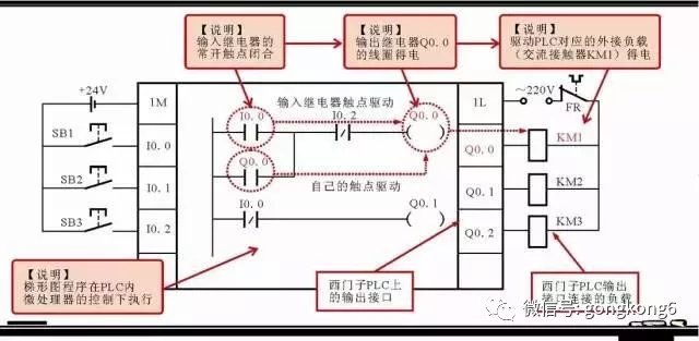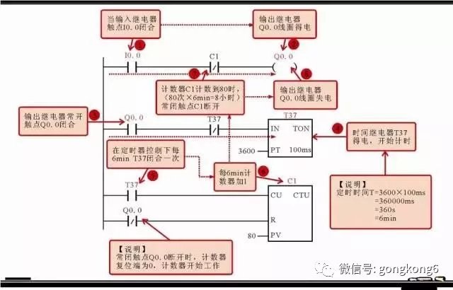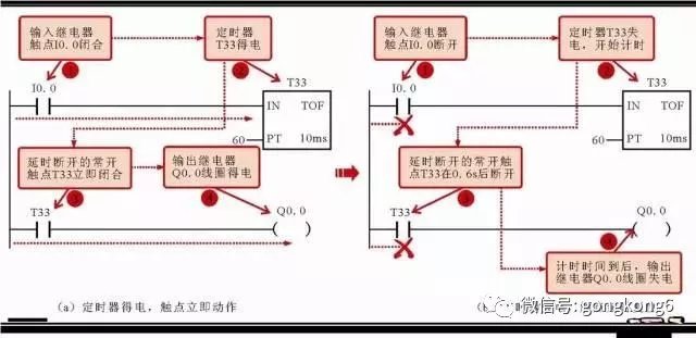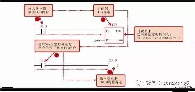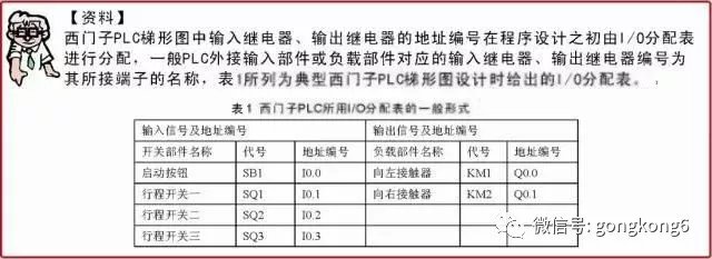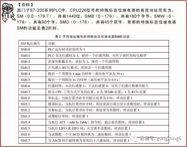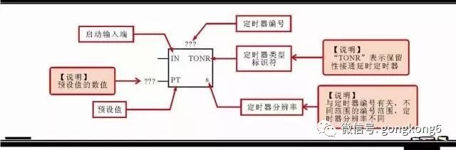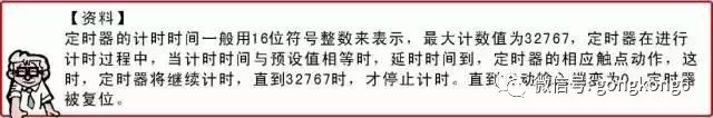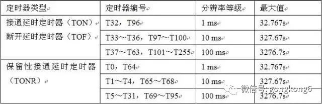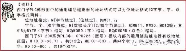 在西门子plc梯形图中,将其触点和线圈等称为程序中的编程元件。编程元件也称为软元件,是指在plc编程时使用的输入/输出端子所对应的存储区以及内部的存储单元、寄存器等。 根据编程元件的功能,西门子plc梯形图中的常用的编程元件主要有输入继电器(I)、输出继电器(Q)、辅助继电器(M、SM)、定时器(T)、计数器(C)和一些其他较常见的编程元件等。 1、输入继电器(I)的标注 西门子PLC梯形图中的输入继电器用“字母I+数字”进行标识,每个输入继电器均与PLC的一个输入端子对应,用于接收外部开关信号。 输入继电器由PLC端子连接的开关部件的通断状态(开关信号)进行驱动,当开关信号闭合时,输入继电器得电,其对应的常开触点闭合,常闭触点断开,如图1所示。 ![]() 图1 西门子PLC梯形图中的输入继电器 2、输出继电器(Q)的标注 西门子PLC梯形图中的输出继电器用“字母Q+数字”进行标识,每一个输出继电器均与PLC的一个输出端子对应,用于控制PLC外接的负载。 输出继电器可以由PLC内部输入继电器的触点、其他内部继电器的触点或输出继电器自己的触点来驱动,如图2所示。 ![]() 图2 西门子PLC梯形图中的输出继电器 ![]() 3、辅助继电器(M、SM)的标注 在西门子PLC梯形图中,辅助继电器有两种,一种为通用辅助继电器,一种为特殊标志位辅助继电器。 (1)通用辅助继电器的标注。通用辅助继电器,又称为内部标志位存储器,如同传统继电器控制系统中的中间继电器,用于存放中间操作状态,或存储其他相关数字,用“字母M+数字”进行标识,如图3所示。 ![]() 图3 西门子PLC梯形图中的通用辅助继电器 ![]() 由图3可以看到,通用辅助继电器M0.0既不直接接受外部输入信号,也不直接驱动外接负载,它只是作为程序处理的中间环节,起到桥梁的作用。 (2)特殊标志位辅助继电器的标注。特殊标志位辅助继电器,用“字母SM+数字”标识,如图4所示,通常简称为特殊标志位继电器,它是为保存PLC自身工作状态数据而建立的一种继电器,用于为用户提供一些特殊的控制功能及系统信息,如用于读取程序中设备的状态和运算结果,根据读取信息实现控制需求等。一般用户对操作的一些特殊要求也可通过特殊标志位辅助继电器通知CPU系统。 ![]() 图4 西门子PLC梯形图中的特殊标志位辅助继电器 ![]() 4、定时器(T)的标注 在西门子PLC梯形图中,定时器是一个非常重要的编程元件,用“字母T+数字”进行标识,数字从0~255,共256个。不同型号的PLC,其定时器的类型和具体功能也不相同。在西门子S7-200系列PLC中,定时器分为3种类型,即接通延时定时器(TON)、保留性接通延时定时器(TONR)、断开延时定时器(TOF),三种定时器定时时间的计算公式相同,即 T=PT×S (T为定时时间,PT为预设值,S为分辨率等级) 其中,PT预设值根据编程需要输入设定值数值,分辨率等级一般有1ms、10ms、100ms三种,由定时器类型和编号决定,见表3所示。 表3 西门子S7-200定时器号码对应的分辨率等级及最大值等参数 ![]() (1)接通延时定时器(TON)的标注。接通延时定时器是指定时器得电后,延时一段时间(由设定值决定)后其对应的常开或常闭触点才执行闭合或断开动作;当定时器失电后,触点立即复位。 接通延时定时器(TON)在PLC梯形图中的表示方法如图5所示,其中,方框上方的“???”为定时器的编号输入位置;方框内的TON代表该定时器类型(接通延时);IN为起动输入端;PT为时间预设值端(PT外部的“???”为预设值的数值);S为定时器分辨率,与定时器的编号有关,可参照表3。 图5 接通延时定时器(TON)在PLC梯形图中的表示方法 例如,某段PLC梯形图程序中所用定时器编号为T37,预设值PT为300,定时分辨率为100ms,如图6所示。 可以计算出,该定时器的定时时间为300×100ms=30000ms=30s;则在该程序中,当输入继电器I0.3闭合后,定时器T37得电,延时30s后控制输出继电器Q0.0的延时闭合的常开触点T37闭合,使输出继电器Q0.0线圈得电。 ![]() 图6 接通延时定时器(TON)应用 ![]() (2)保留性接通延时定时器(TONR)的标注。保留性接通延时定时器(TONR)与上述的接通延时定时器(TON)原理基本相同,不同之处在于在计时时间段内,未达到预设值前,定时器断电后,可保持当前计时值,当定时器得电后,从保留值的基础上再进行计时,可多间隔累加计时,当到达预设值时,其触点相应动作(常开触点闭合,常闭触点断开)。 保留性接通延时定时器(TONR)在PLC梯形图中的表示方法如图7所示,其中,方框上方的“???”为定时器的编号输入位置;方框内的TONR代表该定时器类型(接通延时);IN为起动输入端;PT为时间预设值端(PT外部的“???”为预设值的数值);S为定时器分辨率,与定时器的编号有关,可参照表。 ![]() 图7 保留性接通延时定时器(TONR)在PLC梯形图中的表示方法 (3)断开延时定时器(TOF)的标注。断开延时定时器(TOF)是指定时器得电后,其相应常开或常闭触点立即执行闭合或断开动作;当定时器失电后,需延时一段时间(由设定值决定),其对应的常开或常闭触点才执行复位动作。 断开延时定时器(TOF)在PLC梯形图中的表示方法与上述两种定时器基本相同,如图8所示为断开延时定时器(TOF)的典型应用。 ![]() 图8 断开延时定时器(TOF)的应用 由图8可以看到,该程序中所用定时器编号为T33,预设值PT为60,定时分辨率为10ms。 可以计算出,该定时器的定时时间为60×10ms=600ms=0.6s;则该程序中,当输入继电器I0.3闭合后,定时器T38得电,控制输出继电器Q0.0