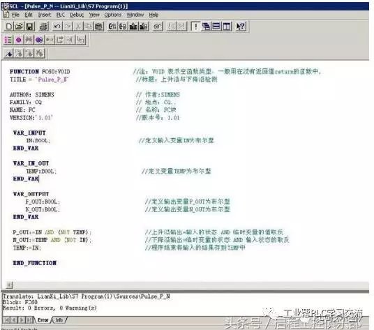 一、程序结构 ![]() 1、 程序结构统一 OB1:主程序; OB100:初始化程序(无需主程序调用); OB35:100ms(可修改)中断(无需主程序调用),可以调用PID模块; OB80、OB82、OB85、OB86、OB87、OB121、OB122:故障诊断模块(无需主程序调用、无需编程); FC1:系统模式; FC2:输入处理; FC3:输出处理; FC4:运行处理; FC5:停止处理; FC6:手自动切换; FC7: 。。。 。。。 FC100:之后用来建立一些可以循环调用的子程序; FC105:系统自带,模拟量输入子程序(可以循环调用); FC106:系统自带,模拟量输出子程序(可以循环调用); modbus通讯(CP341):FB7:P_RCV_RK,FB8:P_SND_RK; 通讯CP340:FB2:P_RCV,FB3:P_SND; 一般PID:用FB41; 温、湿度PID:用FB58; 如果程序块与系统块重复,请避让。 2、 数据块 DB1:AI数据,类型:REAL,与上位机接口; DB2:AO数据,类型:REAL,与上位机接口; DB3:DI数据,类型:BOOL,与上位机接口; DB4:DO数据,类型:BOOL,与上位机接口; DB5:设备运行时间及流量累计,类型:REAL,与上位机接口; DB6:报警消息,类型:BOOL,与上位机接口; DB7:类型:REAL,中间寄存器; DB8:类型:INT,中间寄存器; DB9:类型:WORD,中间寄存器; DB10:类型:BOOL,中间寄存器; DB11:之后用作与设备通讯用,例如:MODBUS通讯等; DB100:之后用作调用FB块时的背景数据块; M区:也作为中间变量。 3、 DP从站故障诊断 DP从站必须做故障诊断,故障报警,用FB125即可。 ![]() 二、控制模式 1、 系统设置远程/本地/手动按钮 1.1、 远程:只能通过上位机对系统进行自动启/停控制,单台设备就地控制优先,在程控时,可以通过上位机对设备进行软手操/自动切换,软手操启/停; 1.2、 本地:只能通过触摸屏对系统进行自动启/停控制,单台设备就地控制优先,在程控时,可以通过触摸屏对设备进行软手操/自动切换,软手操启/停; 1.3、 手动:手动控制时,上位机/触摸屏失效,只能通过手动控制设备的启/停。 2、 单台设备控制 单台设备必须有软手操/自动切换以及软手操时可以启/停功能,由自动切换到软手操时,设备不能停机;由软手操切换到自动时,设备启/停取决于自动程序。 3、 单台设备(泵、风机及其它大型设备)运行满24小时必须进行轮换,且必须有运行时间累计,如果由上位机设定启/停顺序除外,操作人员自行设定; 三、编程技巧 1、 程序块尽量细化,方便阅读,将同一类型的设备控制放在一个程序块中; 2、 如遇特殊情况下采用语言编程,多数情况下请使用梯形图编程,方便别人阅读; 3、 对于经常调用的子程序,可以做成子模块,频繁调用,例如:求几个数平均值或求几个数的最大值; 4、 程序要有注释,变量及中间变量必须有描述,方便别人阅读或以后查阅; 5、 定期做程序备份,最好以工程名称+系统名称+当天日期; 6、 程序加密,防止别人窃取。 四、西门子PLC按照控制规模来分类 可以分为大型机、中型机和小型机。 西门子PLCS7-300系列 西门子PLCS7-300系列 小型机:小型机的控制点一般在256点之内,适合于单机控制或小型系统的控制。 西门子小型机有S7-200:处理速度0.8~1.2ms ;存贮器2k ;数字量248点;模拟量35路 。 中型机:中型机的控制点一般不大于2048点,可用于对设备进行直接控制,还可以对多个下一级的可编程序控制器进行监控,它适合中型或大型控制系统。 西门子中型机有S7-300:处理速度0.8~1.2ms ;存贮器2k ;数字量1024点;模拟量128路 ;网络PROFIBUS;工业以太网;MPI。 大型机:大型机的控制点一般大于2048点,不仅能完成较复杂的算术运 西门子PLCS7-400系列 算还能进行复杂的矩阵运算。它不仅可用于对设备进行直接控制,还可以对多个下一级的可编程序控制器进行监控。 西门子大型机有S7-400 :处理速度0.3ms / 1k字; 存贮器512k ;I/O点12672; ![]() ![]() |