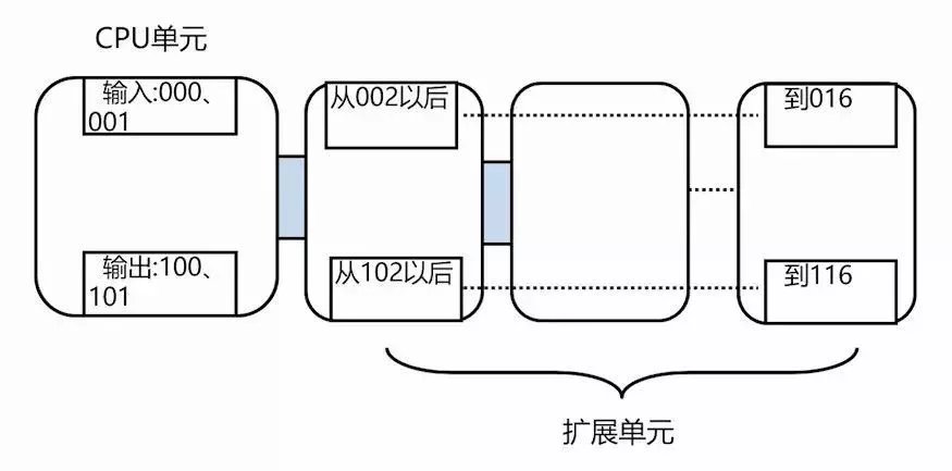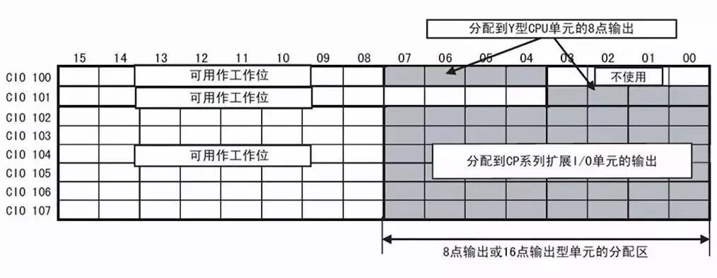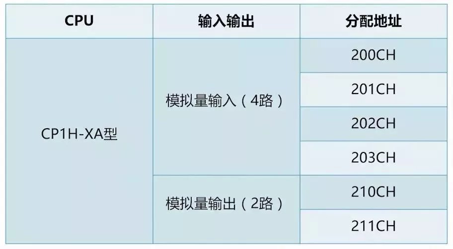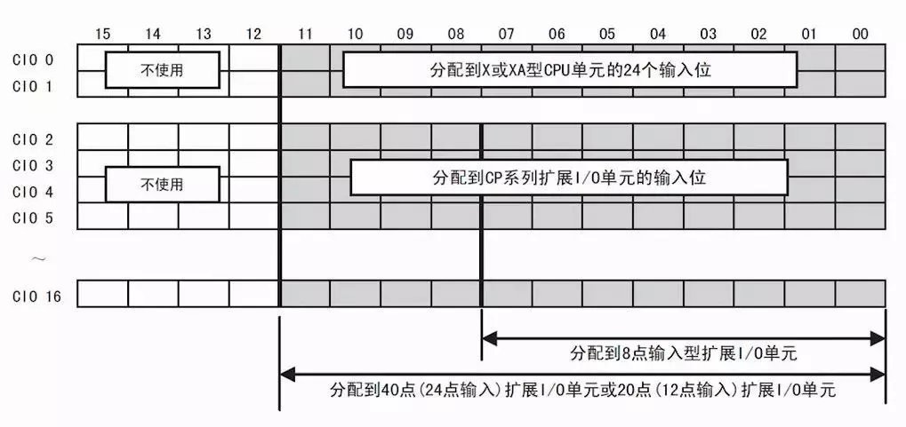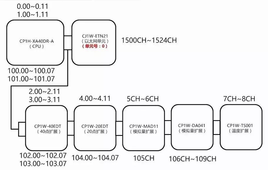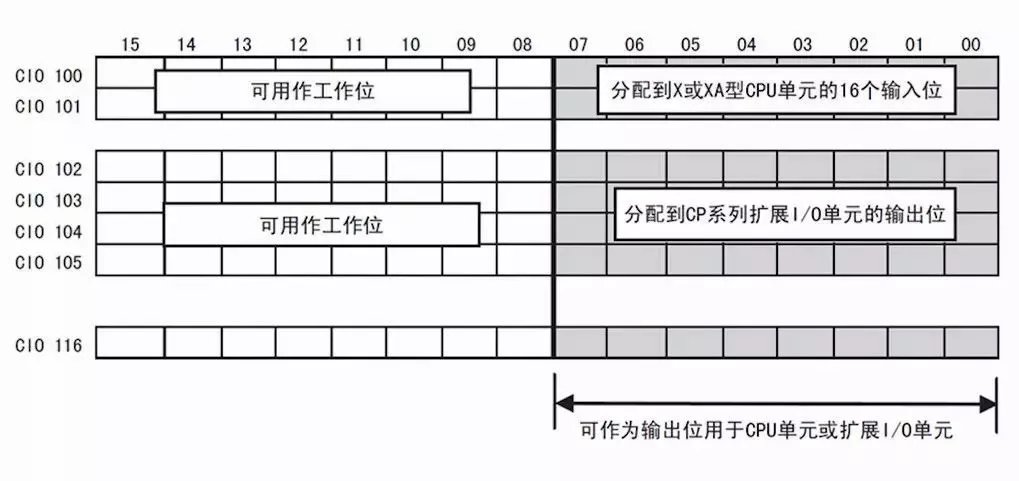 欧姆龙PLC系统中的单元,根据前后位置或单元的特殊性,分别占用CIO区不同的地址,了解地址分配、知道输入、输出数据的具体存放位置,就能够利用编程对数据进行正确的处理。 第一讲欧姆龙PLC的地址分配 在I/O存储器中,CPU单元和CP1W扩展单元的输入地址占用000 ~ 016通道,输出地址占用100 ~ 116通道,而1个通道就是我们所说的1个字,它也等于16个位,本篇我们以CP1H为例,来说明PLC地址分配的规律。 ![]() 1、CPU单元地址分配 X和XA型CPU X和XA型CPU单元自带40点I/O,其中输入24点,输出16点,在CIO区输入部分占用0 ~ 1通道,总共分配24个输入位: ① 其中12个位为0通道的位00 ~ 位11 ② 另12个位为1通道的位00 ~ 位11 ③ 0通道和1通道中不使用的位12 ~ 位15,将始终被清除,且不可用作内部辅助工作位 ![]() X和XA型CPU单元的输出16点,在CIO区输出部分占用100 ~ 101通道,总共分配16个输出位: ① 其中8个位为100通道的位00 ~ 位07 ② 另8个位为101通道的位00 ~ 位07 ③ 100通道和101通道的位08 ~ 位15,可用作内部辅助工作位 ![]() CP1H-XA型CPU中自带了模拟量输入和输出,其中4路模拟量输入占用200 ~ 203通道,2路模拟量输出占用210 ~ 211通道。 ![]() Y型CPU CP1H-Y型CPU中自带20点I/O,其中输入12点,输出8点,由于脉冲输入输出专用端子占用,输入输出被分配到不连续的地址: ① 所以Y型CPU单元的输入,占用CIO区0通道和1通道的共计12点 ② 0通道和1通道中不使用的位12 ~ 位15,将始终被清除,且不可用作内部辅助工作位 ![]() Y型CPU单元的输出8点,也是由于脉冲输入输出专用端子占用: ① CPU单元的输出占用CIO区100通道和101通道的共计8点 ② 100通道和101通道中不使用的位08 ~ 位15,可用作内部辅助工作位 ![]() 2、扩展单元地址分配 扩展单元的作用是扩展输入、输出,扩展单元从CPU单元的分配通道之后的下一个通道开始,依次往后分配地址。 CP1W扩展单元 如CPU单元自带输入占用0通道和1通道,输出占用100通道和101通道,以后连接的CP1W的扩展单元: ① 其输入从2通道开始依次往后分配,最多分配到16通道 ② 输出从102通道开始依次往后分配,最多分配到116通道 ![]() CP1W的基本I/O扩展单元,根据输入输出的点数不同,其所分配的输入输出通道数也不同,位分配原则与CPU单元输入输出的位分配原则相同,例如12点输入、8点输出的扩展单元,输入输出各占用1个通道: ① 其输入位占用所分配通道的位00 ~ 位11,不使用的位12 ~ 位15将始终被清除,且不可用作内部辅助工作位 ② 输出位占用所分配通道的位00 ~ 位07,不使用的位08 ~ 位15可用作内部辅助工作位 ![]() 对于模拟量及温度传感器等扩展单元,其输入输出通道的地址,根据其所占用的通道数来进行分配,例如CP1W-MAD11,分配了2个输入通道和1个输出通道。 ![]() CJ系列高功能扩展单元 CJ系列高功能扩展单元的地址分配和其单元号有关,单元号是在模块上的一个硬件开关,特殊I/O单元根据排列的先后,占用地址2000 ~ 2959通道,具体分配如下图: ![]() CPU总线单元根据排列的先后,占用地址1500 ~ 1899通道,具体分配如下图: ![]() 3、应用举例 如图,CP1H PLC配置了1个以太网模块、2个基本I/O扩展单元、2个模拟量扩展单元和1个温度传感器单元,那么各输入输出的地址是如何分配的呢? ![]() 正确答案如下: ![]() |