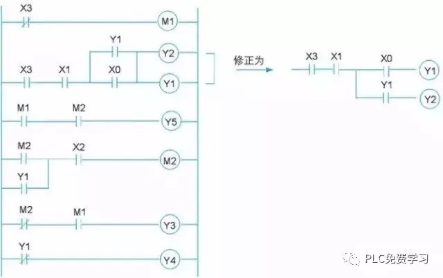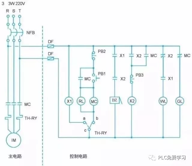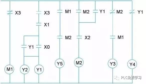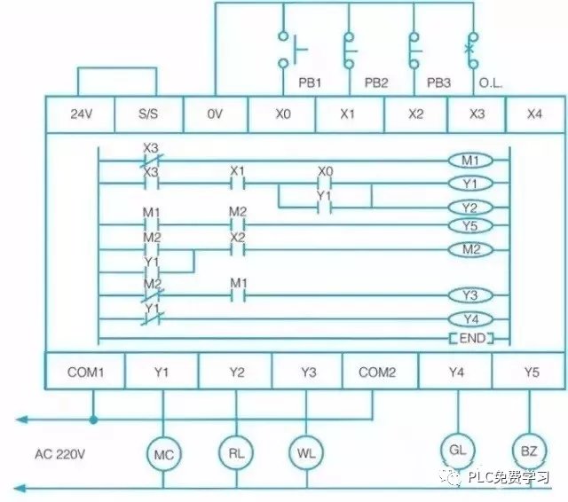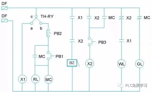 PLC程序设计,一般均采用直觉法,也就是说它植基于电路设计者本身之学习经验,较为主观及直接。须经历一段瞎子摸象的尝试错误(tryanderror)时期,对程序进行除错之后才能符合所需功能或动作要求;因此设计出来的程序因人而异,除了原程序设计者之外,使用者或维修人员较不易理解其动作流程,亦即程序的可读性较低。 但程序设计其实有些许脉络可循,只是坊间的书籍很少提及这一部份。以下姑且抱着野人献曝的心情,以『三相感应电动机故障警报控制』电路为例,由传统电工图转换为阶梯图的过程,浅谈程序设计,相信尔后对于相关的回路转换或程序设计,您或许可触类旁通。 1、传统电工图 已知的三相感应电动机故障警报控制电路,其传统电工图,如图1所示。 ![]() 图1 三相感应电动机故障警报控制电路图 2、动作说明 1.电源正常时,仅绿灯gl亮,电动机不动作。 2.按下启动按钮pb1,电磁接触器mc动作,电动机立即运转,指示灯rl亮,绿灯gl熄。 3.按下停止按钮pb2,电磁接触器mc断电,电动机停止运转,指示灯rl熄,绿灯gl亮。 4.电动机在运转中,因过载或其它故障原因,致使积热电驿th-ry动作,电动机停止运转,蜂鸣器bz发出警报,指示灯rl熄,绿灯gl亮。 5.按下按钮开关pb3,蜂鸣器bz停止警报,白灯wl亮,绿灯gl亮,红灯rl熄。 6.故障排除后,按下积热电驿th-ry复归杆,则白灯wl熄,绿灯gl亮,红灯rl熄,可以重新起动电动机。 3、i/o编码 使用plc,就是以软件程序来取代硬件配线。传统电工图当中,主电路是plc无法取代的;plc可以取代的部份,是控制电路。由传统电工图转换为阶梯图的第一个步骤,就是i/o编码,亦即将传统电工图中的输入/输出组件,先行确定其在plc中所拟对应之外部输入/输出端子编号,以及外部输入组件接线方式是采用a/b接点,如表1所示。 (a):外部採a接点方式接线 (b):外部採b接点方式接线 4、plc外部接线图 输入/输出组件经i/o编码,并决定外部输入组件是采用a/b接点接线方式后,plc外部接线图如图2所示。图中所示为丰炜vigor-vb系列plc机种,采用npn接线,亦即24v端子与s/s端子并接。 ![]() 图2 plc外部接线图 5、plc阶梯图 由传统电工图转换为阶梯图之程序设计步骤如下: (1)将电工图中控制电路直接转成对应阶梯图。因为plc阶梯图中规定,接点在前,输出线圈则必须位于回路的最后。故首先须重新绘制电工图,将图中接点与输出线圈位置适度变更,以符合plc阶梯图的要求,重新绘制后的电工图,如图3所示。 ![]() 图3 重新绘制后的电工图 (2)以i/o编码后的组件编号,取代电工图中的输入/输出组件,此处要留意的是,th-ry的c-a接点及c-b接点要独立出来,各自成为一个控制回路,如图4所示。 ![]() 图4 i/o编码后的的电工图 (3)将图4所示的电工图,向左旋转90°,之后再垂直翻转(upsidedown),即可成为plc阶梯图,但因: (1)y1、x0接点, (2)输出线圈y1和y2,不符合一般编程软件格式,故须适度更正,如图5右方所示。 ![]() 图5 适度翻转并修正后的阶梯图 ※若您使用visio来绘制电工图,则向左旋转90°,之后再垂直翻转,就变的很easy。 (4)使用编程软件绘制之阶梯图,如图6所示,与适度翻转并修正后的阶梯图,完全相同。 ![]() 图6 编程软件绘制之阶梯图 6、指令 将阶梯图转换为指令,则如下所示: ![]() 7、plc转换接线与阶梯图 传统电工图完整转换后之plc外部输入/输出接线与阶梯图。使用软件程序取代硬件配线后之plc外部输入/输出接线与阶梯图,如下图7所示。 ![]() 图7 以软件程序取代硬件配线后之plc 8、结束语 plc其研发目的在于取代以继电器为主之顺序控制,亦即使用软件程序以取代硬件配线,因此祇要改变其软件程序即可改变其控制的顺序,而轻易的达成控制上之不同需求。一般的plc系以传统继电器控制回路为基础发展而来,并将继电器的接点和线圈予以符号化,当转换成一般的阶梯图或指令之后,即可实现其控制。 但如此所完成的控制回路,是基于电路设计者本身之学习经验,较为主观及直接,一般使用者往往不易理解其动作流程,亦即程序的可读性较低。 ![]() |