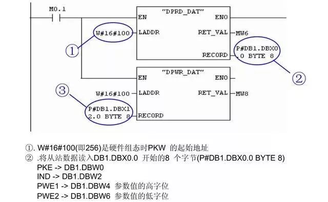 今天主要跟大伙讲解的主要内容是西门子MM440变频器如何通过Profibus -DP与PLC通讯的实现,便于大伙对通讯这一块掌握得更全。 1、需要条件 软件Step7 V5.2SP1 PLC 中具有Profibus -DP 通讯口:S7-315 2DP Profibus 通讯电缆(6XV1830-0AH10) Profibus 总线联结器(6ES7972-0BB10-0XA0, 带PG 接口;6ES7972-0BA10-0XA0 不带PG 接口) MM440变频器1台 Drive 中有Profibus 通讯模板(6SE6400-1PB00-0AA0) 2、 组态主站系统 打开SIMATIC MANAGER, 通过FILE菜单选择NEW新建一个项目,在NAME栏中输入项目名称,将其命名为DP_MM440,在下方的Storage Location中设置其存储位置。 ![]() 项目屏幕的左侧选中该项目,在右键弹出的快捷菜单中选中Insert New Object插入SIMATIC 300 Station,可以看到选择的对象出现在右侧屏幕上。 ![]() 打开SIMATIC 300 Station,然后双击右侧生成的hardware图标,在弹出的HWconfig 中进行组态,在菜单栏中选择“View”选择“Catalog”打开硬件目录,按订货号和硬件安装依次插入机架、电源、CPU。插入CPU时会弹出组态PROFIBUS画面,如下图所示: ![]() 选择“New”新建一条PROFIBUS(1),组态PROFIBUS站地址,点击“Properties”键组态网络属性如下图: ![]() 在本例中主站的传输速率为“1.5Mbps”,“DP”行规,五中继器,OBT等网络元件,点击”OK”键确认并存盘,然后组态S7-315 2DP本地模块,结果如下图: ![]() 3、组态从站 在DP网上挂上MM440,并组态MM440的通讯区,通讯区与应用有关,在组态之前应确认通信的PP0类型,,本例选择PP01,由4PKW/2PZD组成,MM440仅支持PP01和PP03 ![]() 组态步骤如下: A、打开硬件组态,右侧“Profi(standard)”→Profibus-DP→SIMOVERT→双击MICROMASTER 440 B、Profibus interface Properties:输入从站地址4 ![]() ![]() C、选择PPO类型1,双击4PKW/2PZD(PPO1) D、从站组态完成,地址分配从4PKW/2PZD(256-267) 4、MM440硬件及参数设置 A、PROFIBUS地址 下面介绍两种PROFIBUS总线地址的方法:借助通讯模块的七个DIP开关(如下图所示)或借助P0918 ![]() B、通讯板参数 为了让总线板运行,下面的参数必须设置: ![]() 5、程序的编写 对PZD(过程数据)的读写 A、在Step7中对PZD(过程数据)读写参数时调用SFC14和SFC15 B、SFC14(DPRD_DAT)用于读Profibus 从站MM440的数据 C、SFC15(DPRD_DAT)用于将数据写入Profibus 从站MM440 D、硬件组态时PZD的起始地址:W#16#108(即264)微信:503660666 建立数据块DB1 将数据块中的数据地址与从站MM440中的PZD、PKW数据区相对应 ![]() 数据分配 在OB1中调用特殊功能块SFC14和SFC15,完成从站MM440数据的读和写 ![]() 其中LADDR表示:引荐组态时PZD的起始地址(W#16#108即264) ![]() 在本例中设定值和控制字可以从数据块DB1中传送,DB1.DBW20设为047E再变为047F后DB1.DBW22中的频率值将输出,状态字和实际值可从DB1.DBW8,DB1.DBW10读出。微信:503660666 A、控制命令W#16#47F,启动变频器运行 B、给定速度5000含义是500.0rpm。 6、对PKW(参数区)读写 数据传送规则对PKW区数据的访问是同步通讯,即发一条信息,得到返回值后才能发第二条信息。PKW一般为4个子,定义如下: ![]() ![]() 应用举例 A、在Step7中对PKW(参数区)读写参数时同样调用SFC14和SFC15 B、SFC14(DPRD_DAT)用于读Profibus 从站的数据 C、SFC15(DPRD_DAT)用于将数据写入Profibus 从站 D、硬件组态时PKW的起始地址:W#16#108(即264) ![]() ![]() ![]() ![]() |