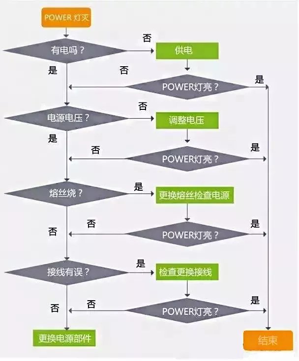 根据总体检查流程图找出故障点的大方向,逐渐细化,以找出具体故障,如下图所示。 ![]() 电源灯不亮需对供电系统进行检查,检查流程图如下图所示。 ![]() 电源正常,运行指示灯不亮,说明系统已因某种异常而终止了正常运行,检查流程图如下图所示。 ![]() 输入输出是PLC 与外部设备进行信息交流的通道,其是否正常工作,除了和输入输出单元有关外,还与联接配线、接线端子、保险管等元件状态有关。检查流程图如下图所示。 ![]() ![]() 影响PLC 工作的环境因素主要有温度、湿度、噪音与粉尘,以及腐蚀性酸碱等。 |