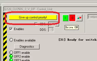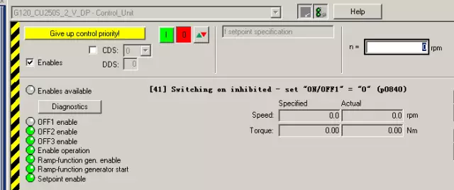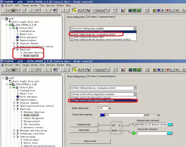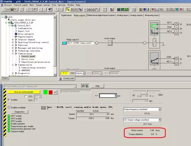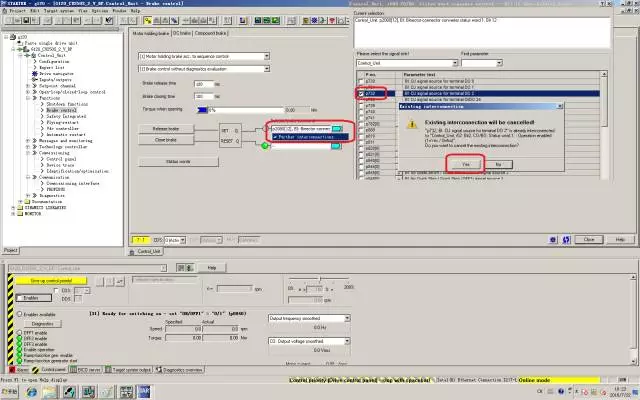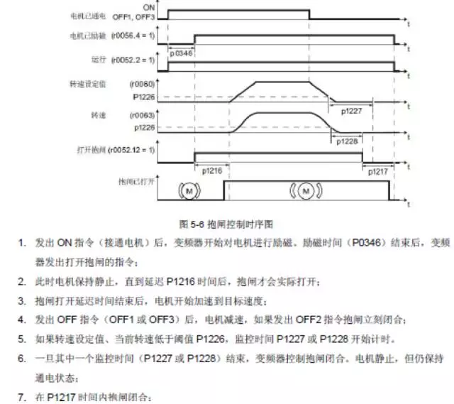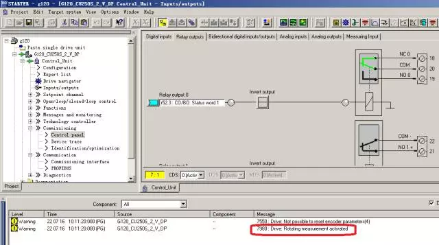 2、此时屏幕上出现报警代码A07991和A07980,提示静态识别和动态优化已经激活; 3、启动变频器,静态识别开始,电机发出蜂鸣声; 4、静态识别结束后,报警代码A07991消失,蜂鸣声消失,变频器自动停机; 5、再一次启动变频器,动态优化开始,电机开始旋转; 6、动态优化结束后,报警代码A07980消失,变频器自动停机; 7、需要的话,P1960=4,做控制器优化;需要启动一次变频器; 逐步操作如下: 4.1 抱闸手动打开,我的抱闸连的是DO2,手动打开,打开比较省心,试过即使是静态辨识,抱闸不打开也会辨识不出来。