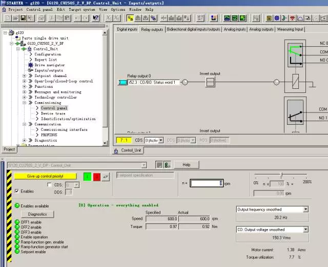4.7 依然按一下绿色启动按钮,电机开始旋转,此时电机会到600rpm,这个数值可以在参数列表里面设置的: