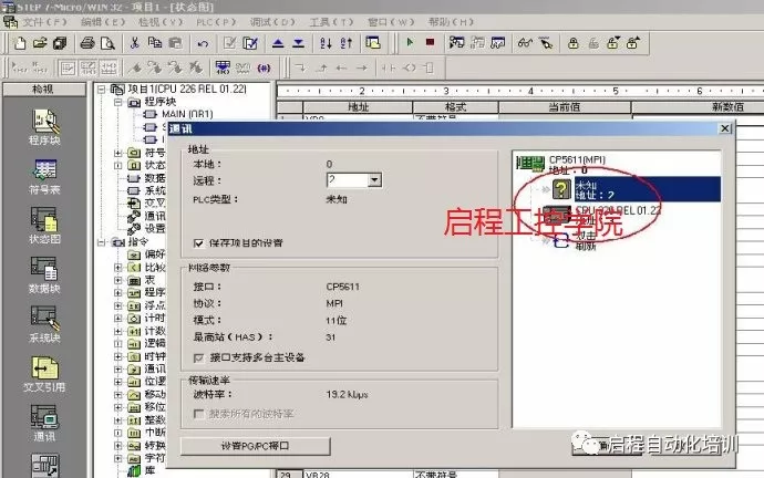 S7200与S7300之间采用MPI 通讯方式时,S7-200 PLC 中不需要编写任何与通讯有关的程序,只需要将要交换的数据整理到一个连续的V存储区当中即可,而S7300 中需要在OB1(或是定时中断组织块OB35)当中调用系统功能X_GET(SFC67)和X_PUT(SFC68),实现S7300 与S7200 之间的通讯,调用SFC67和SFC68 时VAR_ADDR参数填写S7-200 的数据地址区,由于S7-200 的数据区为v 区这里需填写P#DB1.×××BYTE n对应的就是S7200 V存储区当中VB××到VB(××+n)的数据区。 首先根据S7300的硬件配置,在STEP7 当中组态S7300站并且下载,注意S-7200和S-7300出厂默认的MPI地址都是2,所以必须先修改其中一个PLC的站地址,例子程序当中将S-7300MPI地址设定为2,S7200 地址设定3,另外要分别将S-7300和S-7200 的通讯速率设定一致,可设为9.6K,19.2K,187.5K三种波特率,例子程序当中选用了19.2K的速率。S7-200PLC修改MPI地址可以参考下图:
