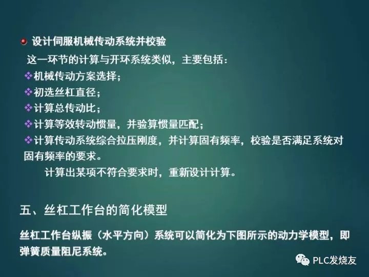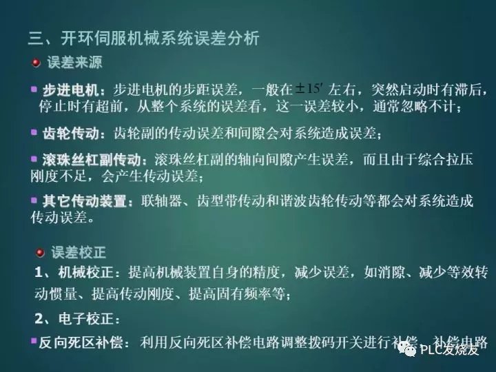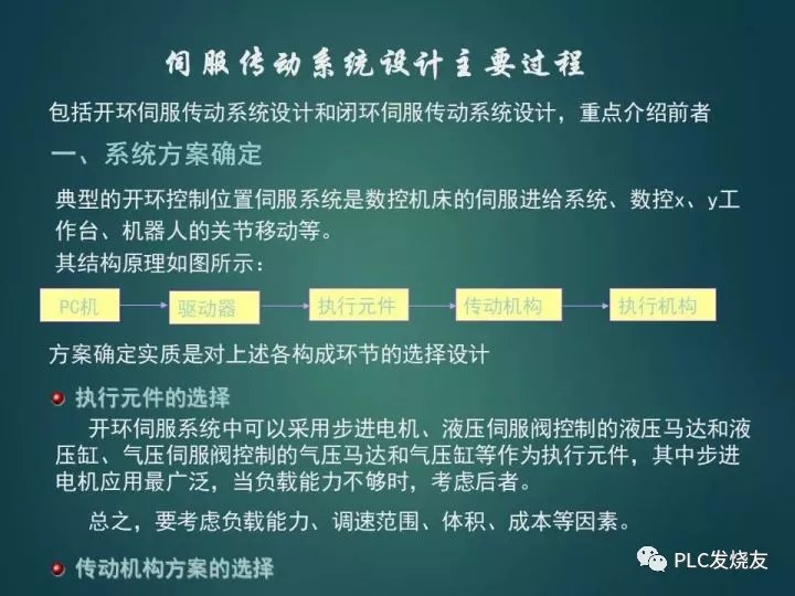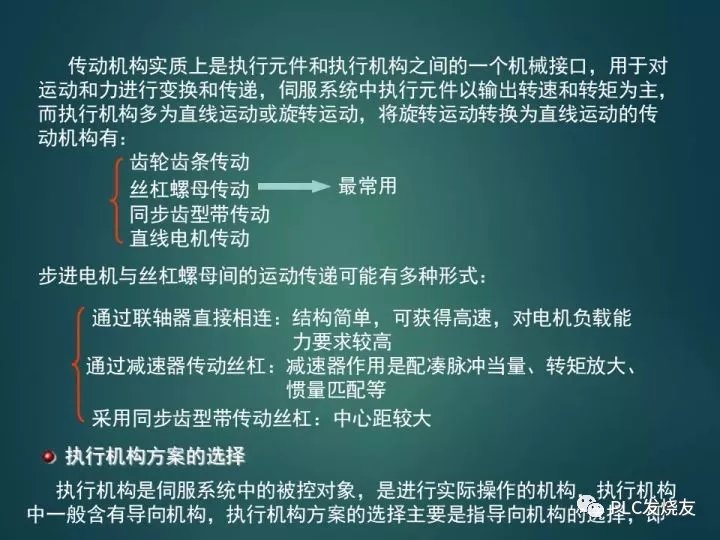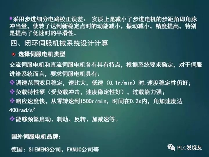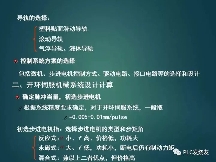 在回答这个问题之前,首先要清楚伺服电机的用途,相对于普通的电机来说,伺服电机主要用于精确定位,因此大家通常所说的控制伺服,其实就是对伺服电机的位置控制。其实,伺服电机还用另外两种工作模式,那就是速度控制和转矩控制,不过应用比较少而已。 速度控制一般都是有变频器实现,用伺服电机做速度控制,一般是用于快速加减速或是速度精准控制的场合,因为相对于变频器,伺服电机可以在几毫米内达到几千转,由于伺服都是闭环的,速度非常稳定。转矩控制主要是 控制伺服电机的输出转矩,同样是因为伺服电机的响应快。应用以上两种控制,可以把伺服驱动器当成变频器,一般都是用模拟量控制。 伺服电机最主要的应用还是定位控制,位置控制有两个物理量需要控制,那就是速度和位置,确切的说,就是控制伺服电机以多快的速度到达什么地方,并准确的停下。 伺服驱动器通过接收的脉冲频率和数量来控制伺服电机运行的距离和速度。比如,我们约定伺服电机每10000个脉冲转一圈。如果PLC在一分钟内发送10000个脉冲,那么伺服电机就以1r/min的速度走完一圈,如果在一秒钟内发送10000个脉冲,那么伺服电机就以60r/min的速度走完一圈。 所以,PLC是通过控制发送的脉冲来控制伺服电机的,用物理方式发送脉冲,也就是使用PLC的晶体管输出是最常用的方式,一般是低端PLC采用这种方式。而中高端PLC是通过通讯的方式把脉冲的个数和频率传递给伺服驱动器。比如: Profibus-DP CANopen、MECHATROLINK-II、EtherCAT等等。 这两种方式只是实现的渠道不一样,实质是一样的,对我们编程来说,也是一样的。这也就是我想跟大家说的,要学习原理,触类旁通,而不是为了学习而学习。 对于程序编写,这个差别很大,日系PLC是采用指令的方式,而欧系PLC是采用功能块的形式。但实质是一样的,比如要控制伺服走一个绝对定位,我们就需要控制PLC的输出通道,脉冲数,脉冲频率,加减速时间,以及需要知道伺服驱动器什么时候定位完成,是否碰到限位等等。无论哪种PLC,无非就是对这几个物理量的控制和运动参数的读取,只是不同PLC实现方法不一样。 (二)如何设计一个伺服系统? ![]() ![]() ![]() ![]() ![]() ![]() ![]() ![]() ![]() ![]() ![]() ![]() ![]() ![]() ![]() ![]() ![]() ![]() |