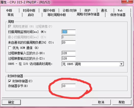 二、硬件CPU时钟存储器的设置,设置闪烁点。题中闪烁信号5HZ,存储器字节选10,OB1软件编程位为1,取点为M10.5. 时钟存储器各位对应的时钟脉冲周期与频率