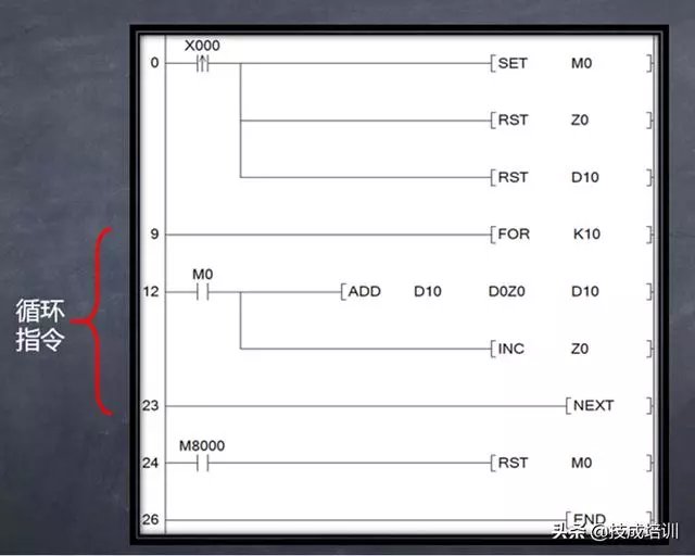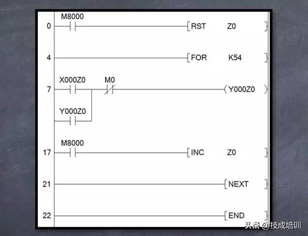 ![]() 如上图,程序的执行过程主要分为3个步骤,输入检测、程序扫描、输出刷新。这是PLC一个工作周期的工作顺序,在扫描的时候某些程序段需要执行多遍,这个时候我们可以使用FOR指令。让程序中的某一段反复执行多遍,然后再往下扫描。 那么,在哪些地方用到它呢。下面我们来看2个应用案例。 ![]() 程序的0到9步,触发X0的上升沿信号,把M0导通,Z0、D10全部清空;第9到23步,是一段循环指令,FOR K10表示这段程序循环10遍。 第一遍,由于变址寄存器Z0里面的数字为0,D0Z0这个地址变为D0(具体参考变址寄存器的用法),ADD D10 D0Z0 D10,这条指令把D10加D0的数据放到D10里面了,由于在程序上面用了D10,所以一开始D10保存的数据为0,经过加法指令,D10里面保存数据就是D0,然后通过INC Z0加一指令,让Z0自加1,等于1.然后进入循环第二遍. 第二遍,Z0里面的数据为1,D0Z0这个地址变为D1,ADD D10 D0Z0 D10这条指令把D10(经过第一遍扫描,D10里面保存了D0)加D1的数据放到D10里面了,那么 D10里面的数据变为D0+D1,然后通过INC Z0加一指令,让Z0自加1,等于2.然后进入循环第三遍。… …第10遍,Z0里面的数据为9,D0Z0这个地址变为D9,ADD D10 D0Z0 D10这条指令把D10(经过第9遍扫描,D10里面保存了D0+D1+… +D8)加D9的数据放到D10里面了,那么 D10里面的数据变为D0到D9里面全部数据的总和,然后通过INC Z0加一指令,然后退出循环,进入下一步。 M8000常通触点段开M0,当进入PLC下一个工作周期时,由于循环指令里面的程序都是由M0常开触点触发的,这是就不会再触发了,也就是,经过一个PLC的工作周期,就把D0到D9里面的数据加起来,放到了D10里面了。 当然,我们也可以写程序来做一些其他的计算。下面我们来看下另外一个应用案例:有54个X点,对应启动54个Y点,需要保持自锁,当按下按钮M0时所有输出停止。 面对这样一个要求,在没有学习循环指令之前,你可能会一段一段的写,需要写54段程序,今天,我们来尝试下用FOR指令来写,如下图。 ![]() 每次进行扫描都会先把Z0清0,然后进入循环(54次),第一遍Z0=0,这时X000Z0的地址是X000,Y000Z0的地址是Y000,X000触发Y000线圈并形成自锁,通过INC指令Z0自加1;第二遍,Z0等于1,这时X000Z0的地址是X001,Y000Z0的地址是Y001,X001触发Y001线圈并形成自锁,通过INC指令Z0自加1; … …这样的话,就把本来很冗长的一大段简化成了一小段,节省程序步数的同时减少了编程的时间。 关于FOR指令,除了以上两种,大家平时还有什么用法? ![]() 技成培训原创,作者:陈育鑫 ![]() |