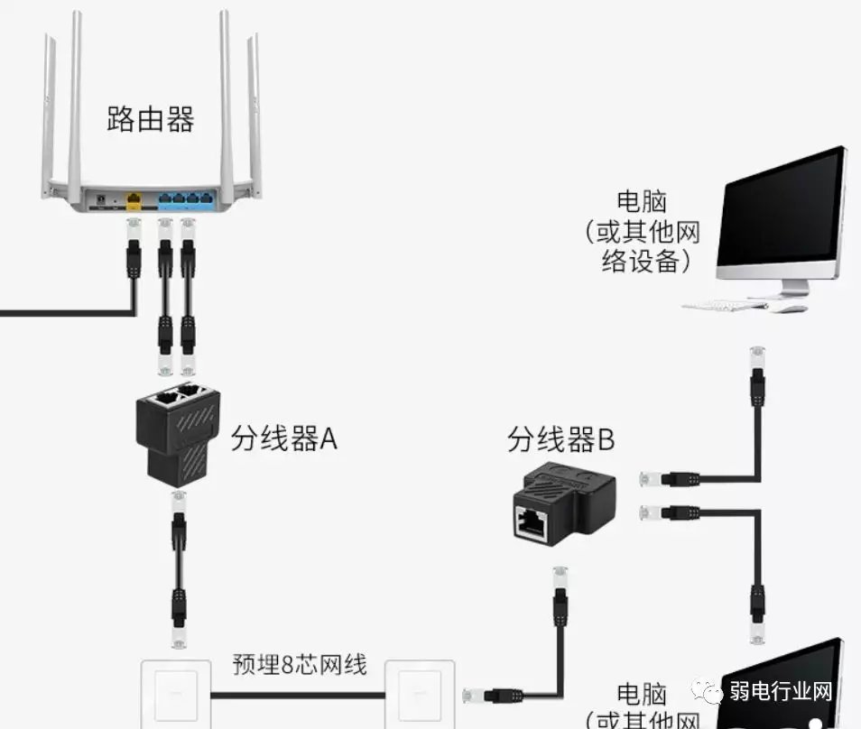 很多家庭装修入户到客厅只埋了一根网线,后续电信的宽带和IPTV,这两个东西线是分开的,要两根网线,只有分线处理了,可能就需要把一根网线一分为二。 家中的网线一般是8芯的,100Mbps的连接方式使用了4芯,1000Mbps接法使用了8芯网线;百兆网络只需要1,2,3,6四芯即可,两芯发送数据,两芯接收数据,其余的四芯可以用于连接另一个网络; 网线一分为二,分为两组,每组传输100Mbps的网络信号。 在百兆网络中,网线中仅有1、2、3、6四根线芯负责网络信号传输,由于网线一般都有八个线芯,可以将一根网线分为两根四芯网线。一根网线分线后相当于两根网线,连接两台电脑的话,需要将分线后的水晶头分别插在路由器或交换机才可以正常上网。 ![]() 方案一 我们常用的网线一般都采用八个线芯,但只有其中1、2、3、6线芯是负责数据传输的,所以一根网线可以分为两根四芯网线。 ![]() 按照568B标准网线的两端可以将白橙,橙,白绿,绿四个线芯按照1、2、3、6线序制作水晶头,将白棕、棕、白蓝、蓝四个线芯按照1、2、3、6线序制作水晶头。 按照568A标准,网线的两端可以将白绿、绿、白橙,橙,四个线芯按照1、2、3、6线序制作水晶头,将白蓝、蓝、白棕、棕四个线芯按照1、2、3、6线序制作水晶头。![]() 一根网线分线后,只有分别连接路由器或交换机,才能让两台电脑同时上网。由于一根网线分线后相当于两根网线,所以只有将分线后的两个水晶头分别和路由器或交换机连接,另外两个水晶头连接电脑,才可以保证两台电脑同时上网。 一根网线分线后最高支持百兆宽带由于四芯网线最高仅支持百兆宽带,所以将一根网线分线后,最高也仅能支持百兆网络。如果使用百兆及以上光纤宽带,一般不建议将一根网线分线使用。另外网线分线,存在干扰的情况,网络传输质量和单根网线还是存在一定差距。 方案二 使用分线器,使用一对分线器,如果办公室已经布好一条网线且只有一个网口,实现两台电脑同时联网或者一个连接电脑一个连接机顶盒,可以使用分线器,如下图所示: ![]() ![]() |