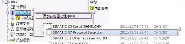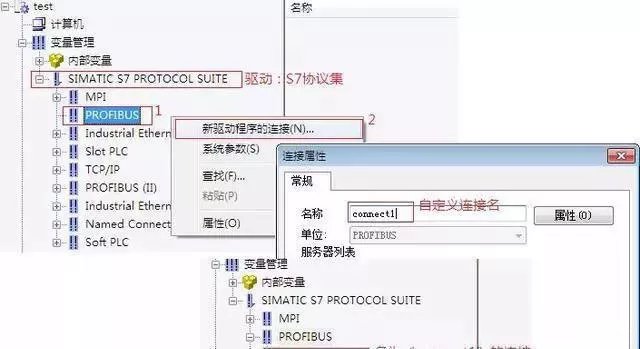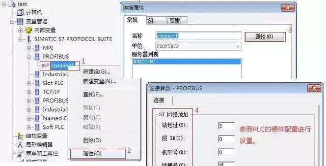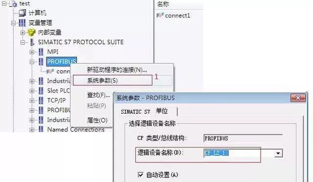 以下所有的讨论都是基于WinCC与仿真PLC(即PLCSIM,如图1所示)之间的通讯的。 ![]() 图1 PLCSIM 一、添加驱动程序 新建一个WinCC项目,右键单击"变量管理",选择"添加新的驱动程序",在打开的窗口中,选择"S7协议集",如图2所示。WinCC与S7-300/400之间的通讯都是基于S7协议集的。 ![]() 图2 添加新的驱动程序 二、建立连接 S7协议集中,包含了诸多通讯协议,如:MPI、PROFIBUS、工业以太网等。根据PLC端实际的硬件配置,选择合适的通讯协议(这里我们选用PROFIBUS协议),按照图3所描述的步骤建立PROFIBUS下的通讯连接。 建立好连接后,要设置连接属性,步骤如图4所示。主要要设置好"站地址","机架号"、"插槽号"等几个值。其信息要到PLC的硬件配置中查询,如图5所示。这几个值不能写错,不然通讯无法建立。 ![]() 图3 建立连接 ![]() 图4 设置连接属性 ![]() 图5 PLC侧的硬件配置信息 三、新建外部变量 在上面建立的连接"connect1"下,新建变量,并与PLC的工程数据建立关联。如图6所示,这里新建一个二进制变量NewTag,并将其与PLC的M0.0关联起来。这样,若PLC侧M0.0变化,则NewTag的值也随之变化;相反,WinCC侧的NewTag改变,M0.0也会相应改变。 ![]() 图6 新建变量 四、设置PG/PC接口 如图7所示,右键点击"PROFIBUS",查看或修改逻辑设备名称,这里要记住其逻辑设备名称:CP_L2_1:。然后打开"设置PG/PC接口"窗口,在"应用程序访问点"中,写入逻辑设备名称"CP_L2_1:",并选择通讯板卡,这里选择"PLCSIM(PROFIBUS)",如图8所示。如此,WinCC与PLC通讯的最后一步也完成了。 ![]() 图7 逻辑设备名称 ![]() 图8 设置PG/PC接口 五、新建画面,测试 新建画面,在画面中分别放置一个"输入/输出域"和一个按钮,实现以下功能: 1、"输入/输出域"关联变量"NewTag",其可以更改并显示"NewTag"的实时值,即M0.0的状态; 2、按下按钮,NewTag的状态反转,即"NewTag=0"时,按下按钮,"NewTag=1",反之,亦然; 3、按钮的背景颜色随"NewTag"的不同而不同,"NewTag=0",背景色为蓝色;"NewTag=1",背景色为绿色。 |